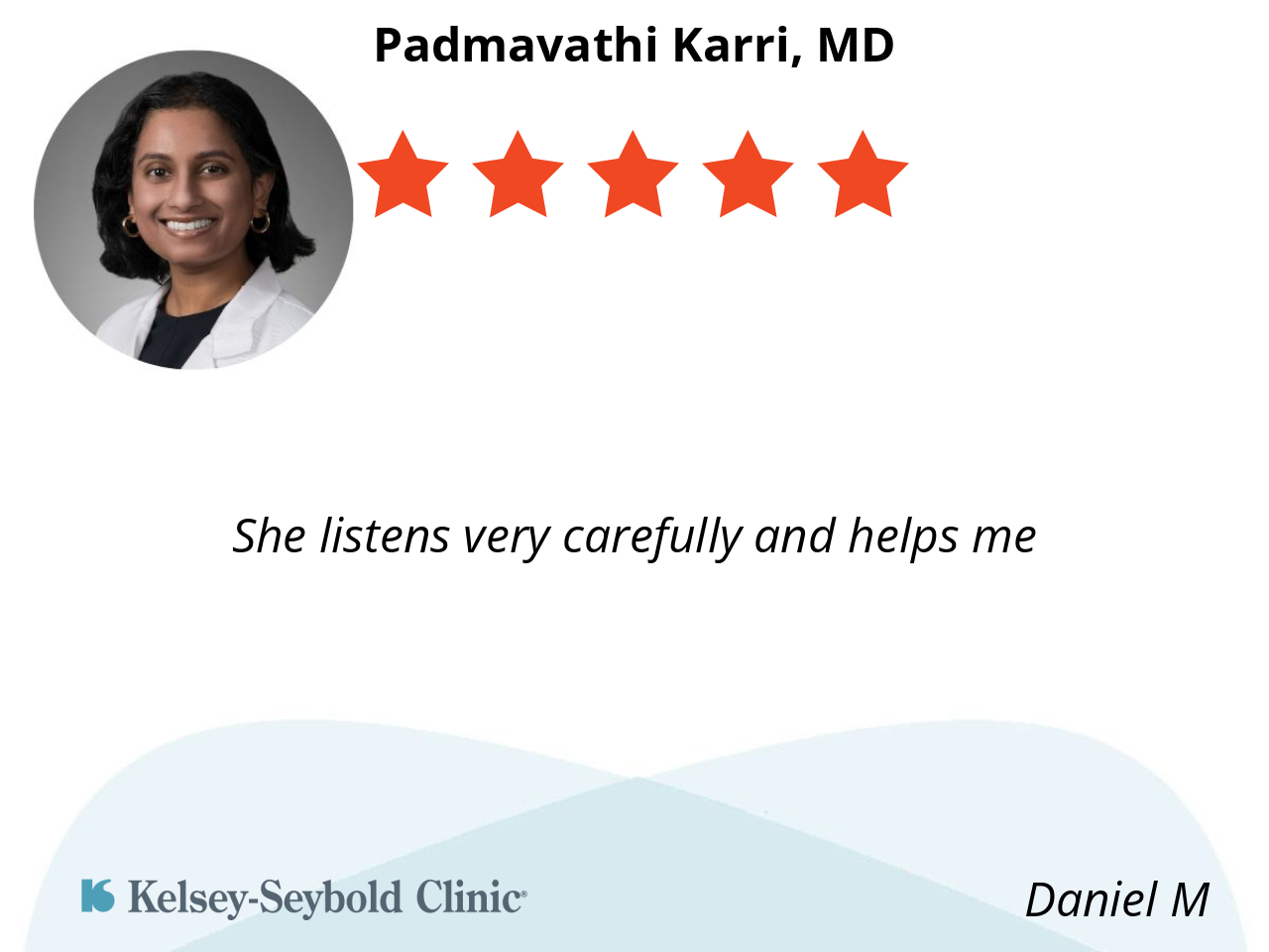 I rarely leave reviews, but Dr. Karri has been well worth every visit. Her office staff is equally caring, professional, and welcoming. I am thankful to have found such an excellent physician and team.