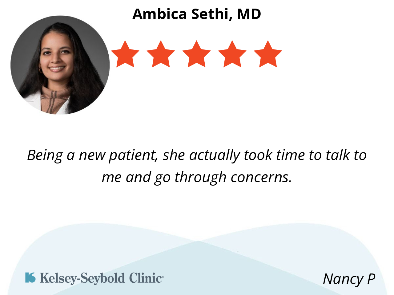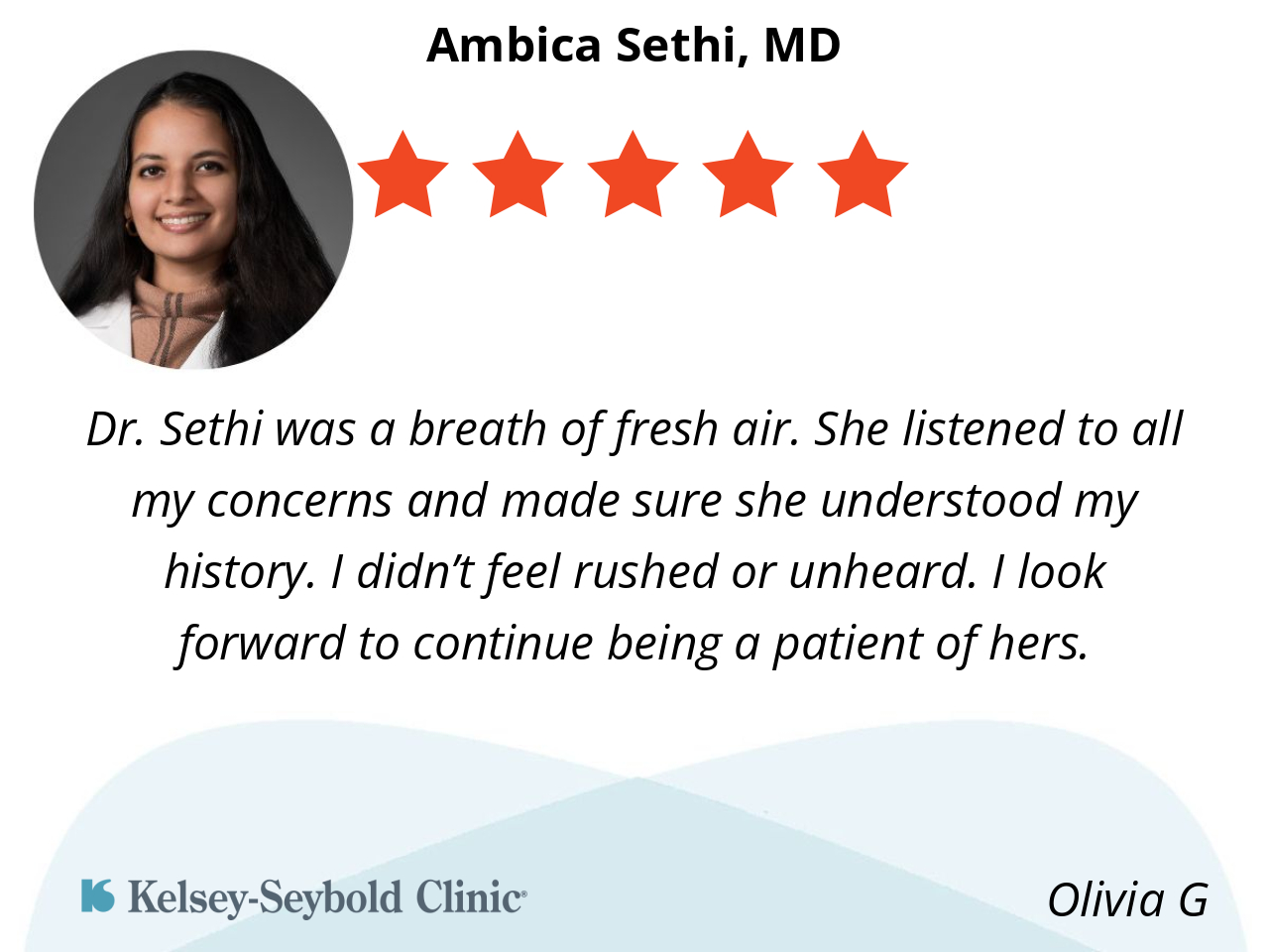 Dr. Sethi was a breath of fresh air. She listened to all my concerns and made sure she understood my history. I didn’t feel rushed or unheard. I look forward to continue being a patient of hers.