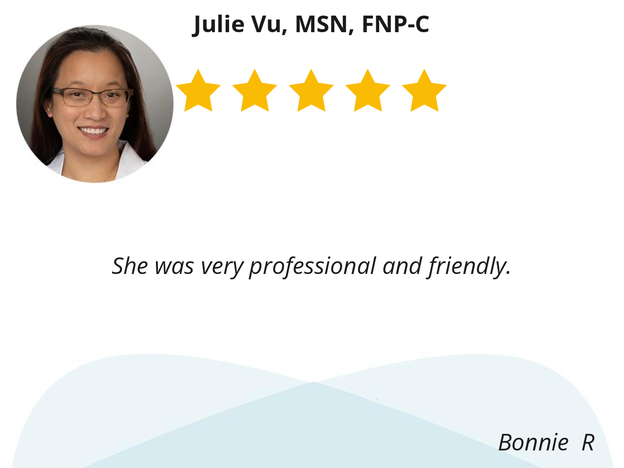 I cannot say enough good things about my FNP, Julie Vu. Providers like her are rare to find these days. She truly cares about her patients’ well-being, takes the time to listen, and goes above and beyond to address their needs. Her compassion, dedication, and professionalism have gained my trust, and I know I’m in excellent hands with her. Julie Vu will forever be my primary care provider, and I highly recommend her to anyone seeking exceptional care. She is truly one of a kind!