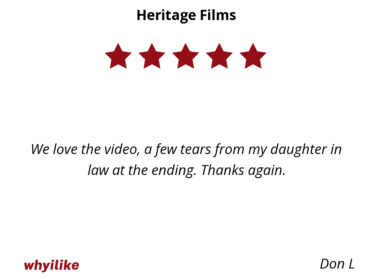 Love these guys. So kind and professional. Mom loved them as well. We knew she had a lot of stories, but we had no idea about some of them! I highly recommend Heritage Films!!!