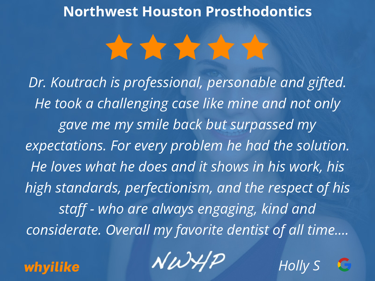 Dr. Kutrach is simply the best. He has a gift for what he does. I had a very complicated case, (full implants) and felt heard and understood throughout the process I am elated with the outcome. The staff could not be better…they are attentive listeners and were fabulously helpful in explaining my personalized treatment plan. There’s only one place to go in my opinion… Northwest Houston Prosthedontics