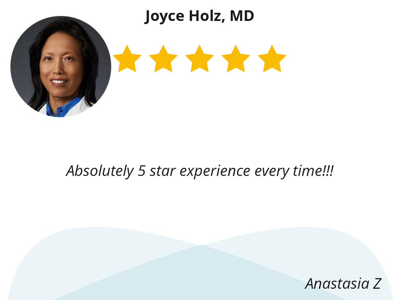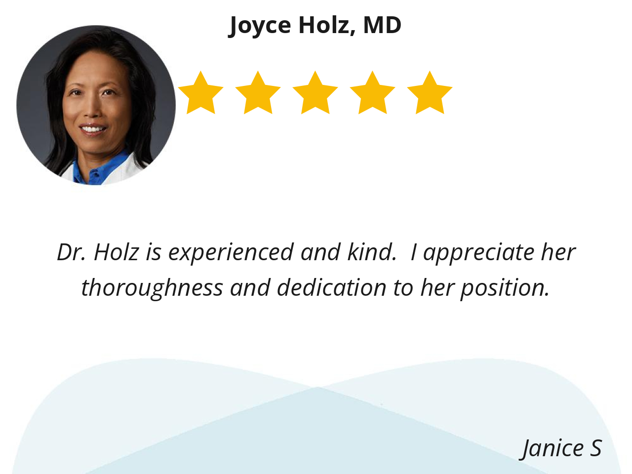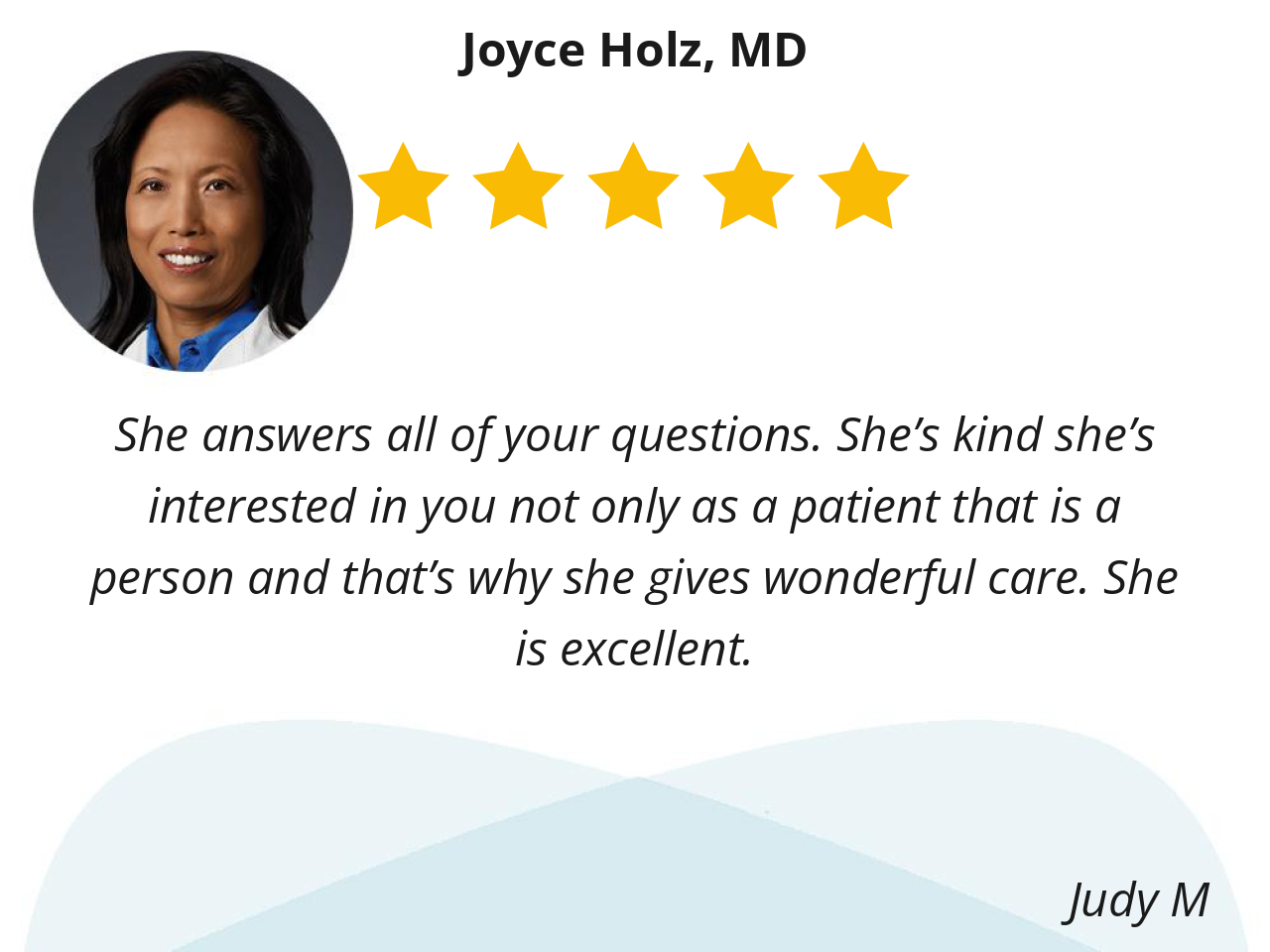 I think Dr. Holz is one of the BEST Doctor's in America! She saved me from many serious health issues and she corrected them by surgery. I am so grateful for Doctor's like her!