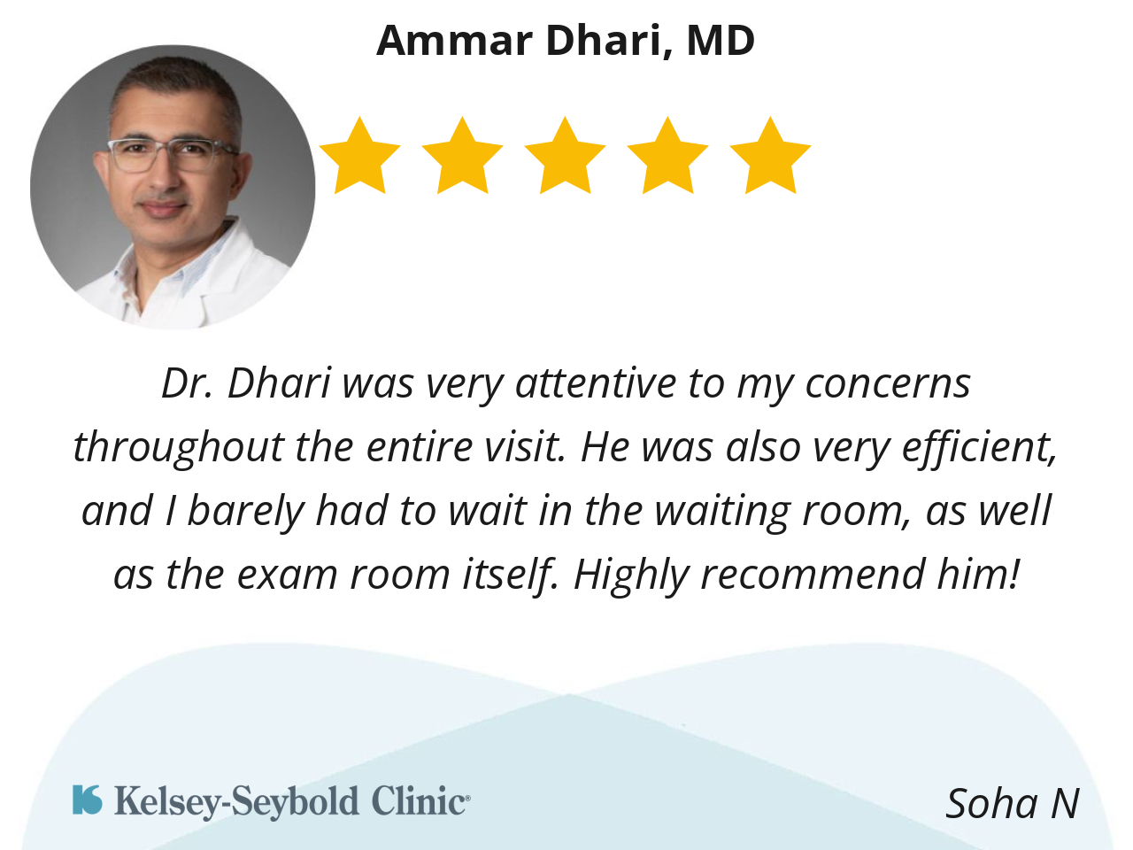 Dr. Dhari was very attentive to my concerns throughout the entire visit. He was also very efficient, and I barely had to wait in the waiting room, as well as the exam room itself. Highly recommend him!
