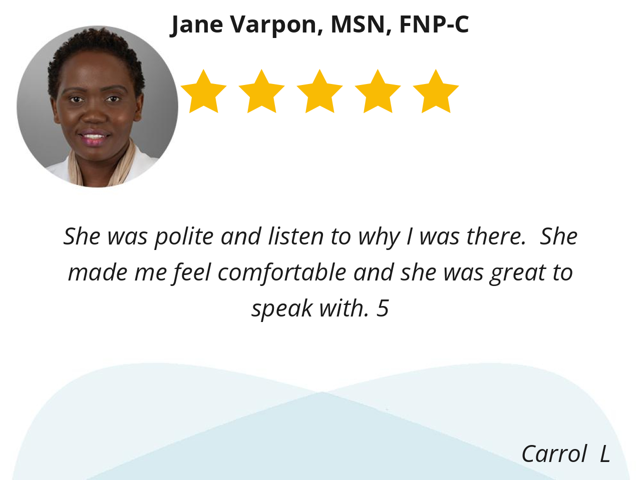 Nurse Practitioner Jane Varpon is outstanding. She is highly knowledgeable and thorough, providing excellent care with genuine compassion. Jane treats every patient with kindness, listens attentively, and explains things clearly, making you feel truly heard and valued. I deeply appreciate her dedication and the trust she inspires.