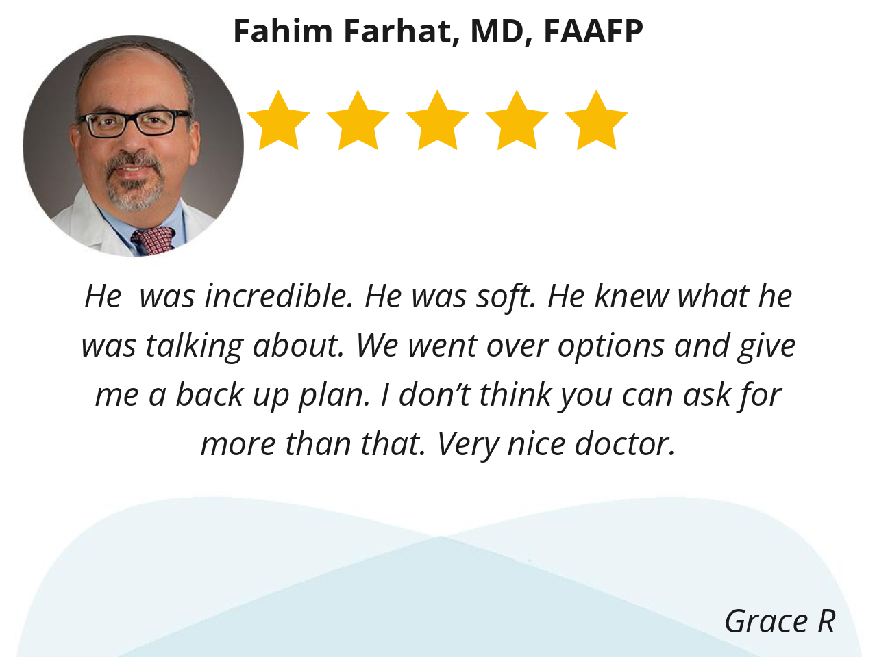 Dr. Farhat is compassionate, he takes his time to listen. Overall, a wonderful doctor and we are so pleased he has been my doctor for over 15 years now.