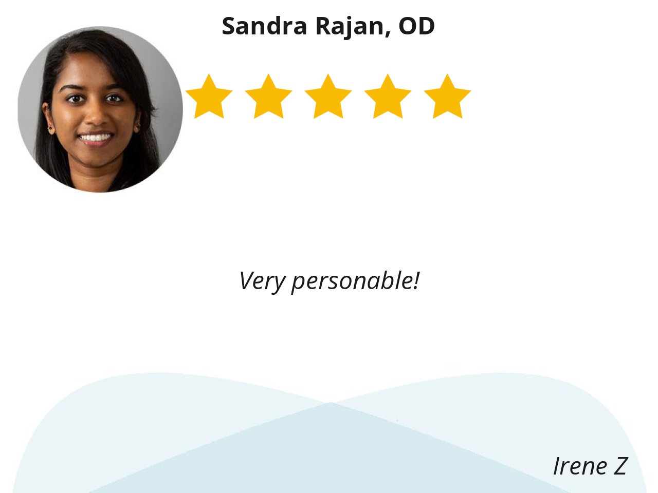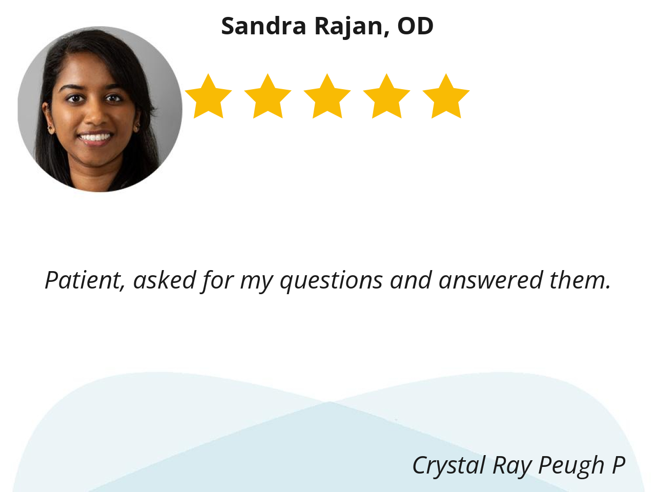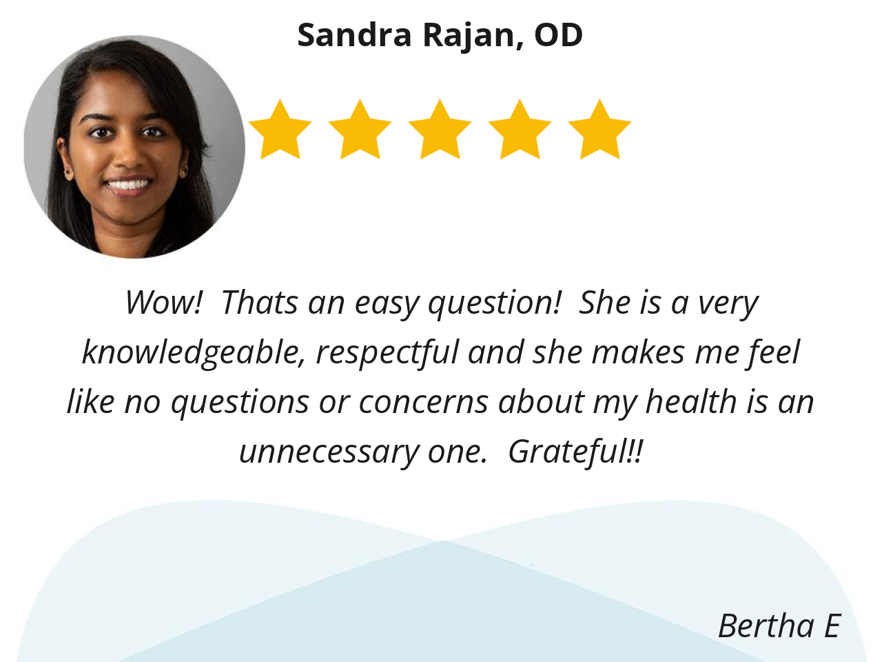 I was impressed and appreciated her cool demeanor insightful response to my questions. I like the fact she went through a host of eye exams to better understand my complaints.