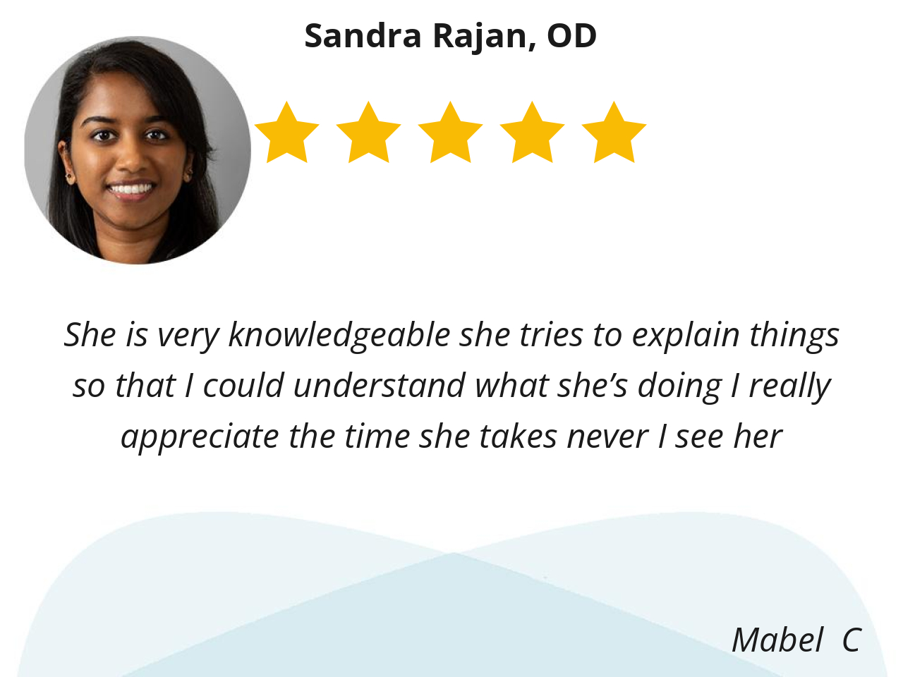 She is competent and gives great explanations that I trust when it comes to my eyecare needs.