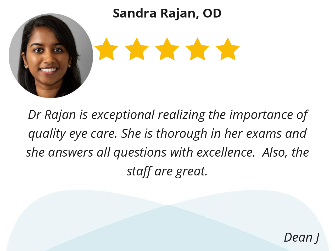 Dr Rajan is exceptional realizing the importance of quality eye care. She is thorough in her exams and she answers all questions with excellence. Also, the staff are great.