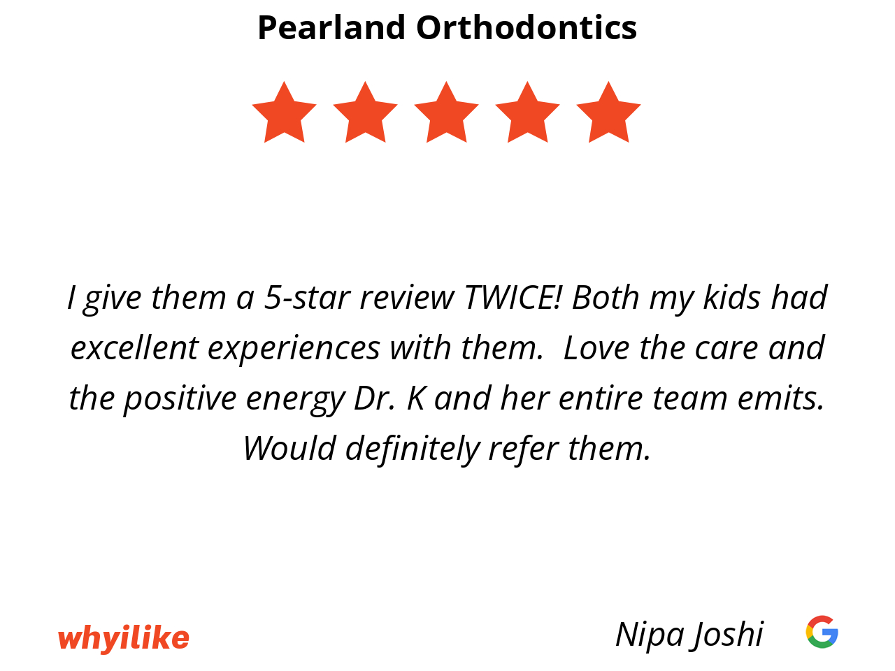 I give them a 5-star review TWICE! Both my kids had excellent experiences with them. Love the care and the positive energy Dr. K and her entire team emits. Would definitely refer them.