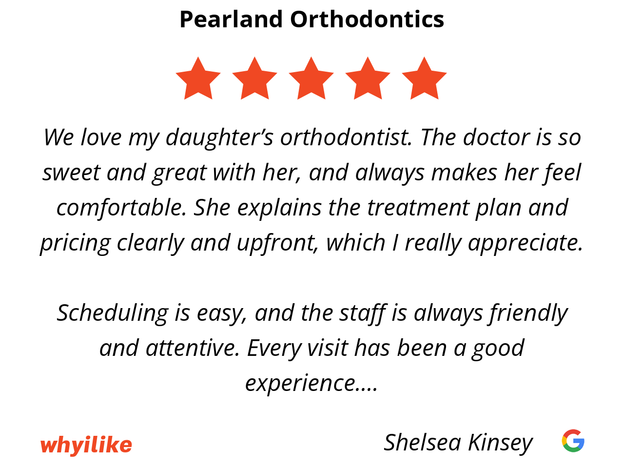 My daughter has had a great experience at Pearland Orthodontics! Dr. K and the entire team have been wonderful. Appointments are always on time, the raffles and prizes are a fun bonus, and the smile transformation has been amazing. We couldn’t be happier and highly recommend Pearland Orthodontics!
