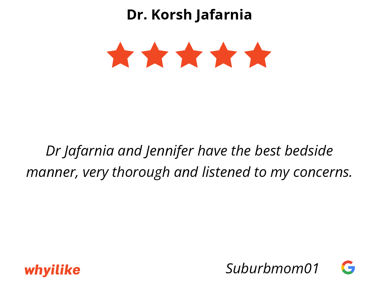 Dr Jafarnia and Jennifer have the best bedside manner, very thorough and listened to my concerns.