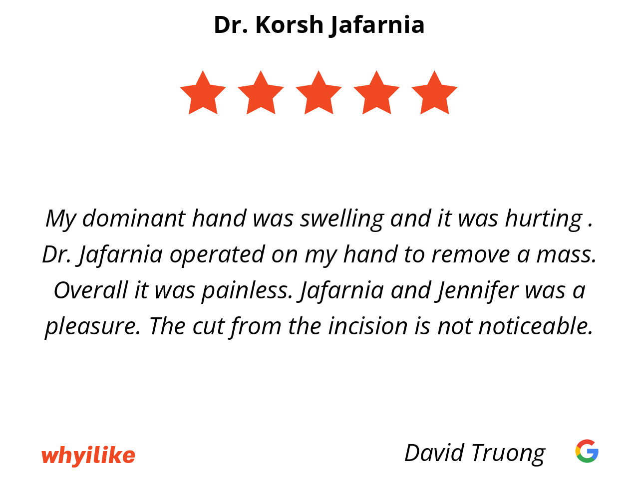 My dominant hand was swelling and it was hurting . Dr. Jafarnia operated on my hand to remove a mass. Overall it was painless. Jafarnia and Jennifer was a pleasure. The cut from the incision is not noticeable.