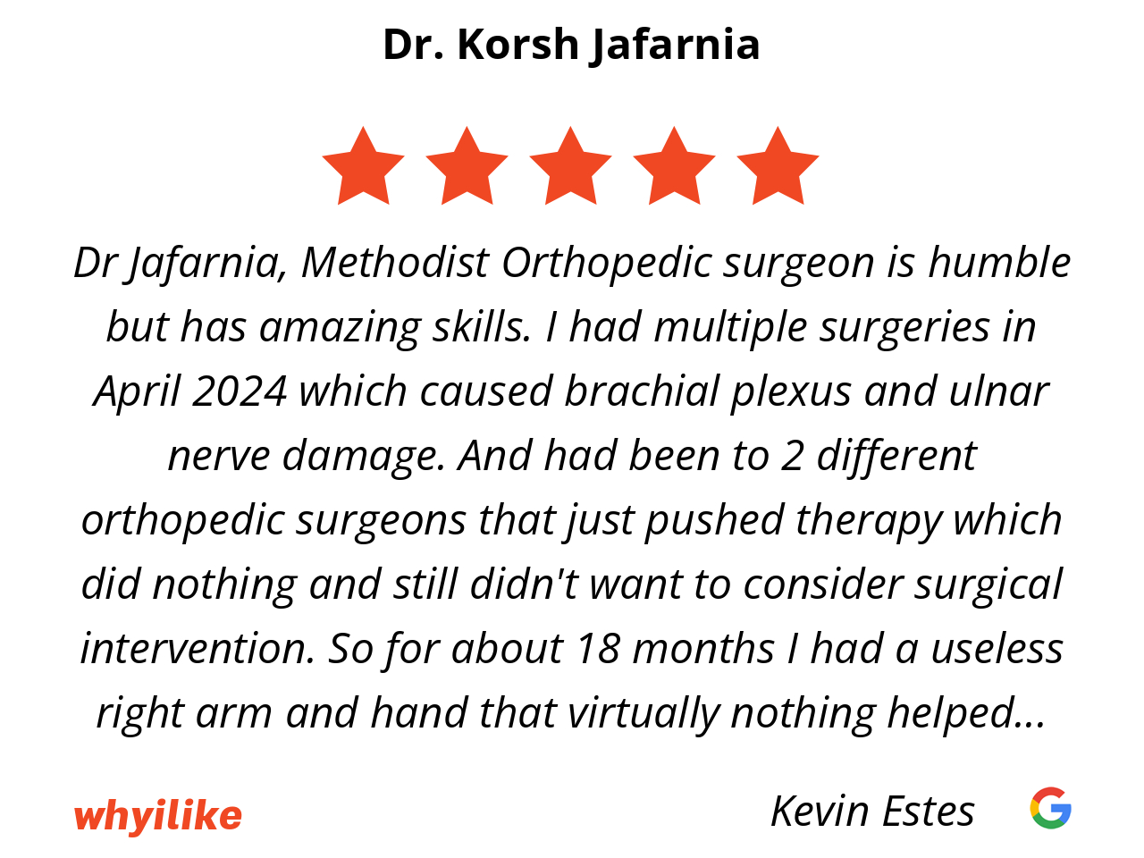 Dr Jafarnia, Methodist Orthopedic surgeon is humble but has amazing skills. I had multiple surgeries in April 2024 which caused brachial plexus and ulnar nerve damage. And had been to 2 different orthopedic surgeons that just pushed therapy which did nothing and still didn't want to consider surgical intervention. So for about 18 months I had a useless right arm and hand that virtually nothing helped with the pain and woke up 5-6 times a night because my arm was throbbing. I was beyond frustrated and my primary care recommended giving Dr Jafarnia a visit. He studied my prior tests and did a thorough exam and agreed the damage was severe and wouldn't be able to help with the ulnar nerve damage and specializes in elbow wrist and hand.As for the brachial plexus that was advice to see another specialist. So there was hope that I could get some relief by going into the elbow and he presented me with multiple versions to release the nerve once I was in the OR. He didn't make any promises and if anything understated the result other than saying he could give me pain relief. The damage was severe I couldn't even write my own name my ring and pinky fingers were curled up most of the time. So I couldn't hold anything without dropping it and the funny bone was constantly sending jolts of shocks. Well it's been 3 weeks since the surgery and I have no more numbness or throbbing and full use of my hand. Anyone who knows me and what I had experienced are shocked by the results. I can't thank Dr Jafarnia and his staff enough for their compassion positivity and support. I just wish I had been more diligent a year ago. But in the end my daily routine and quality of life was restored and greatly enhanced after what other surgeons led me to believe was impossible was made possible by Dr Jafarnia. And he even has recommended Dr Echo who he said is the best when it comes to brachial plexus nerve damage. Dr Jafarnia is passionate and was gifted with a unique skill set and I am fortunate that he not only agreed to do the surgery. It has definitely changed my life for the better.