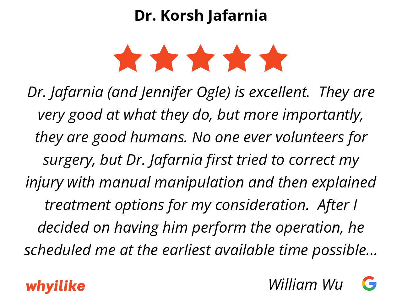 Dr. Jafarnia (and Jennifer Ogle) is excellent. They are very good at what they do, but more importantly, they are good humans. No one ever volunteers for surgery, but Dr. Jafarnia first tried to correct my injury with manual manipulation and then explained treatment options for my consideration. After I decided on having him perform the operation, he scheduled me at the earliest available time possible (the following Monday morning after he checked for the very same Friday afternoon of my initial consultation).