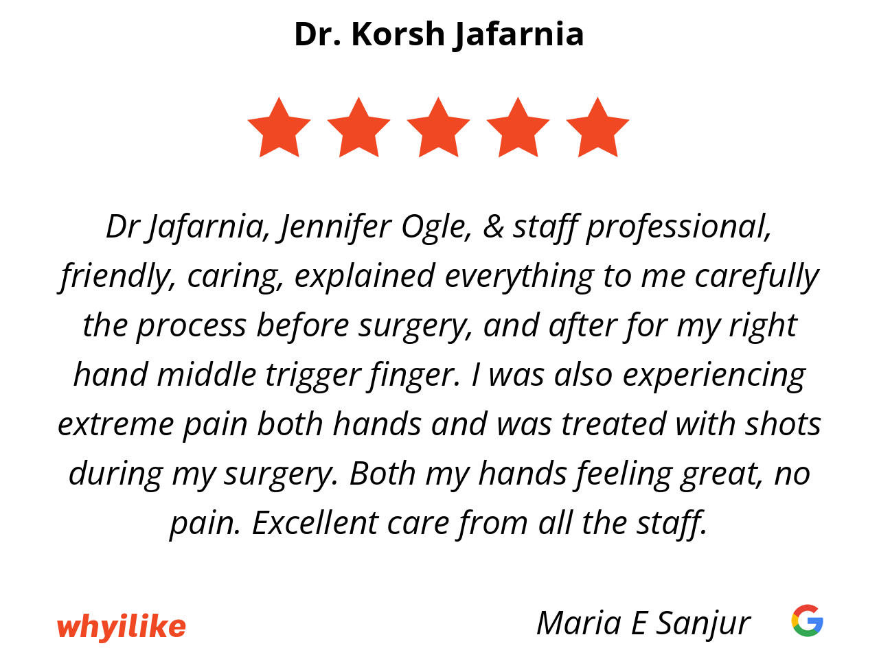 Dr Jafarnia, Jennifer Ogle, & staff professional, friendly, caring, explained everything to me carefully the process before surgery, and after for my right hand middle trigger finger. I was also experiencing extreme pain both hands and was treated with shots during my surgery. Both my hands feeling great, no pain. Excellent care from all the staff.