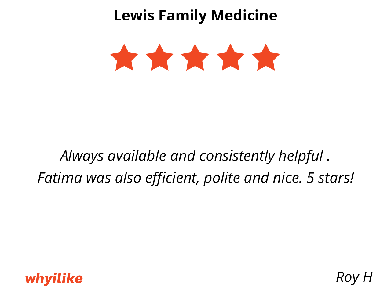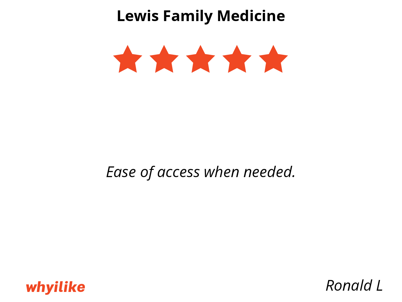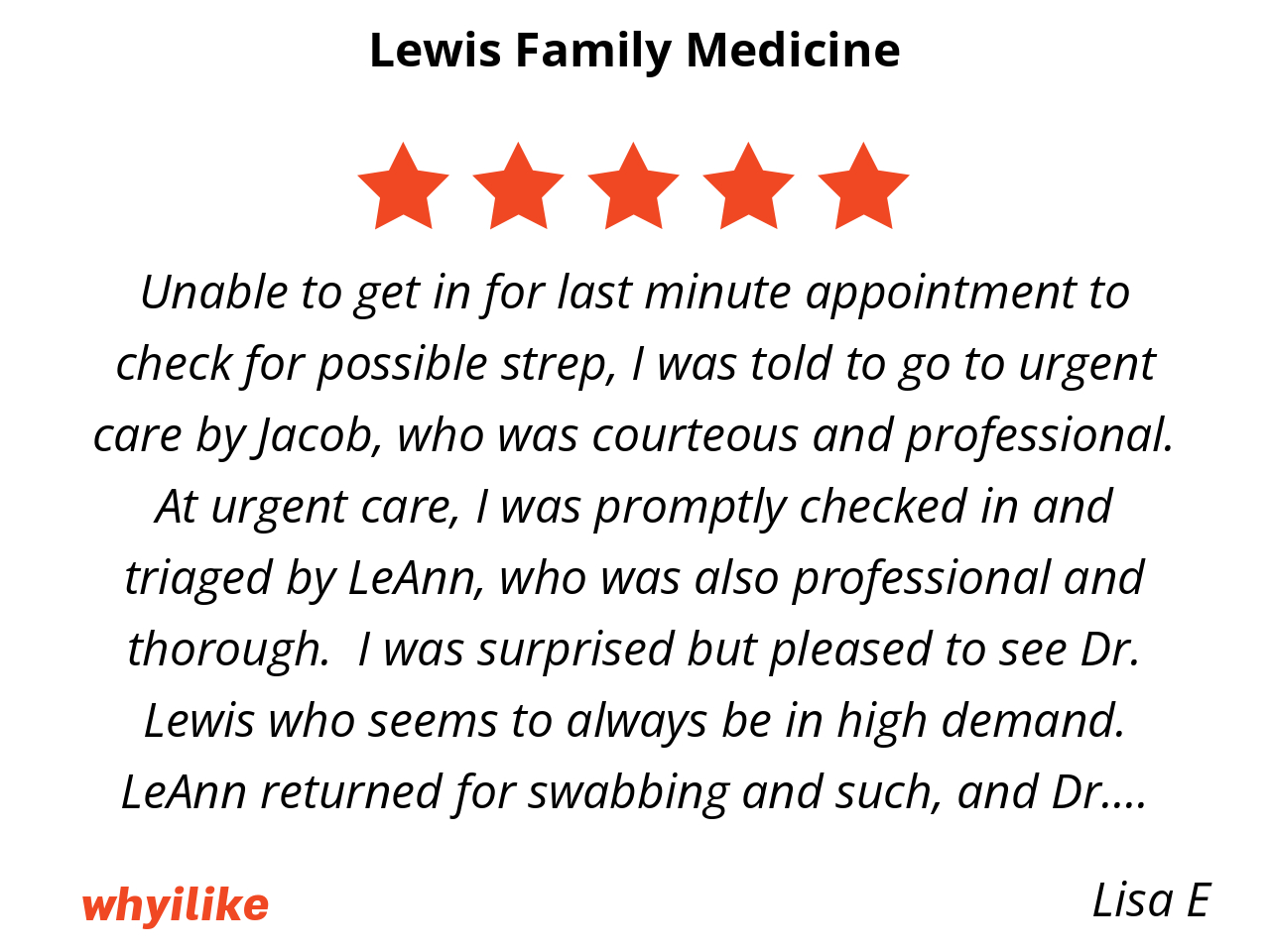 I’ve been to Lewis Family Medicine for both primary care and urgent care, and every visit has been exceptional. Their team is refreshingly direct and up-front—they don’t gloss over anything, and they always take a truly holistic approach to my health. They connected the dots in ways my previous doctor never did and gave me far more context and clarity about my treatment plan. From check-in to check-out, everyone was professional, caring, and genuinely invested in my wellbeing. 10/10—highly recommend!