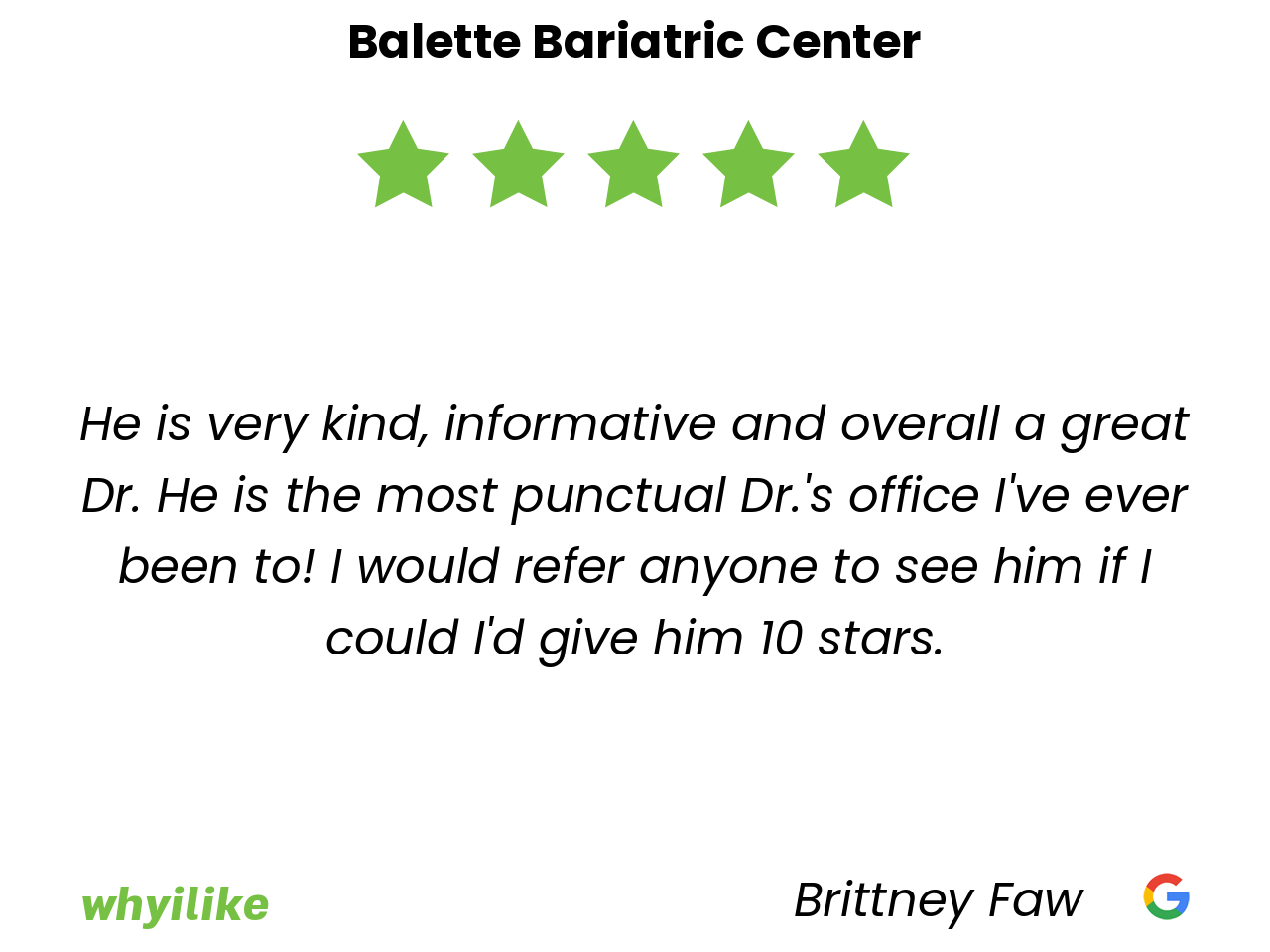 I met Dr. Balette 11yrs ago. He helped save my life. The past 2yrs, he has performed 2 surgeries on me. I love Dr. Balette & his staff. He has a very good bedside manner. And walked me through every step of my procedure. He’s a blessing to all he comes in contact with. May his services continue to heal and make healthy. Big shout out to the world’s best bariatric surgeon.