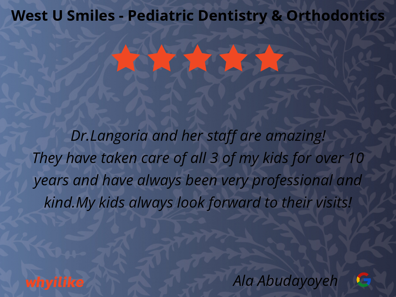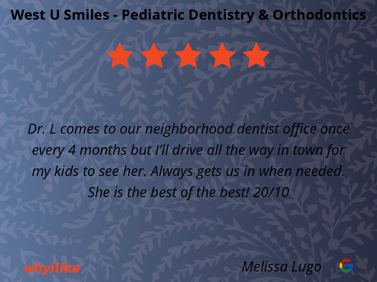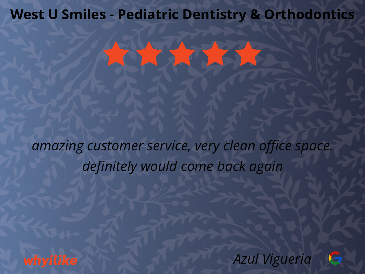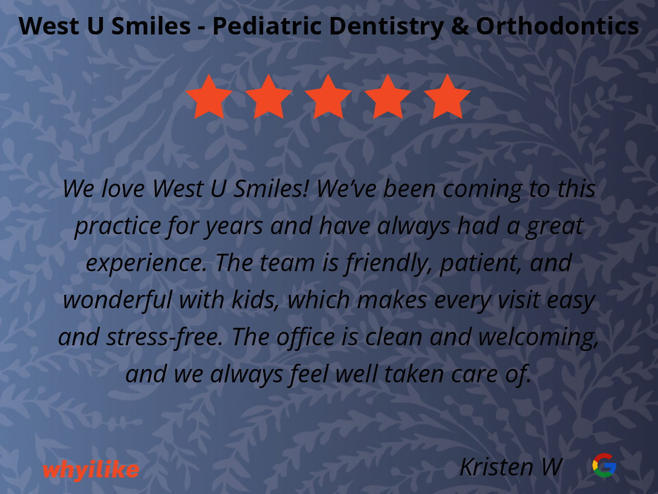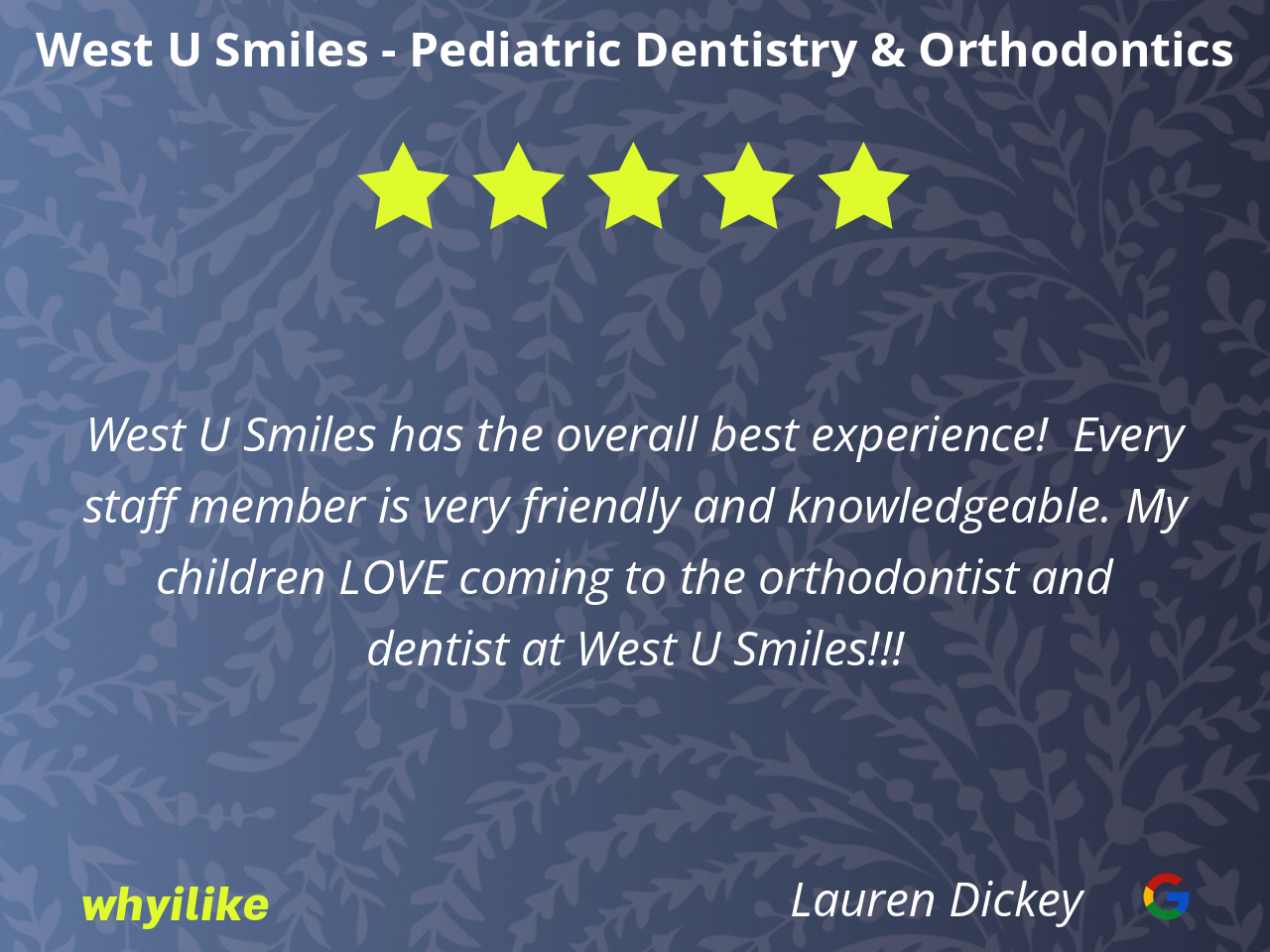 West U Smiles has the overall best experience! Every staff member is very friendly and knowledgeable. My children LOVE coming to the orthodontist and dentist at West U Smiles!!!
