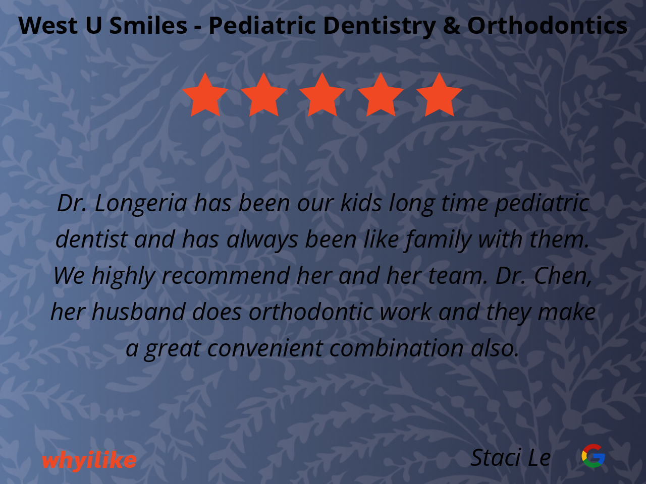 Dr. Longeria has been our kids long time pediatric dentist and has always been like family with them. We highly recommend her and her team. Dr. Chen, her husband does orthodontic work and they make a great convenient combination also.