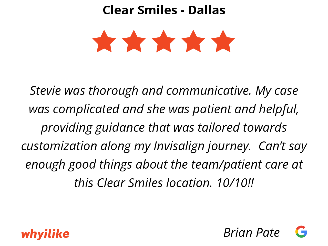 Absolutely loved my experience with clear smiles! Luis & Stevie we’re awesome throughout my whole journey. Literally the best team. & my teeth are exactly the way I’ve wanted them to look for years!!! I’d definitely recommend clear smiles in down town Dallas every chance I get!