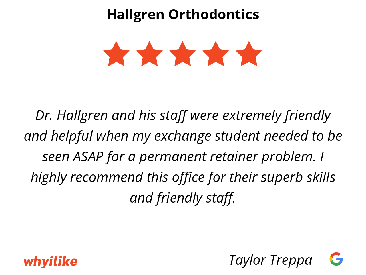 Dr. Hallgren and his staff were extremely friendly and helpful when my exchange student needed to be seen ASAP for a permanent retainer problem. I highly recommend this office for their superb skills and friendly staff.