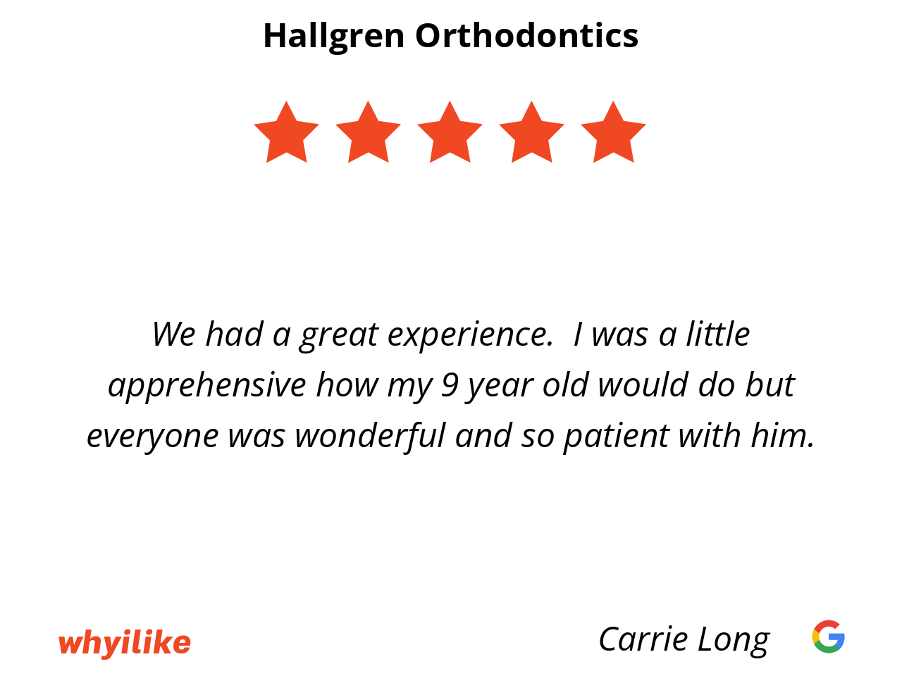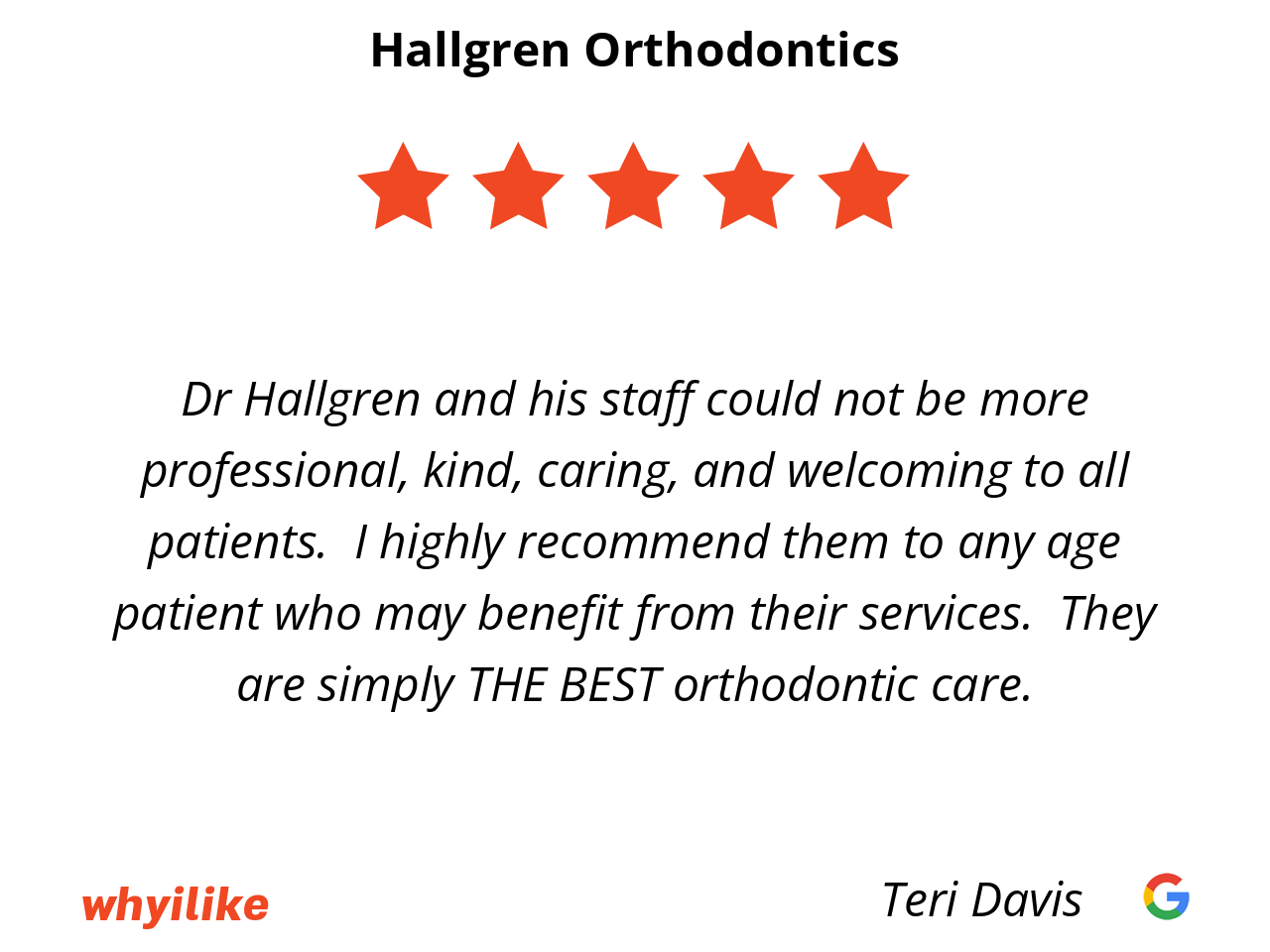 Dr Hallgren and his staff could not be more professional, kind, caring, and welcoming to all patients. I highly recommend them to any age patient who may benefit from their services. They are simply THE BEST orthodontic care.
