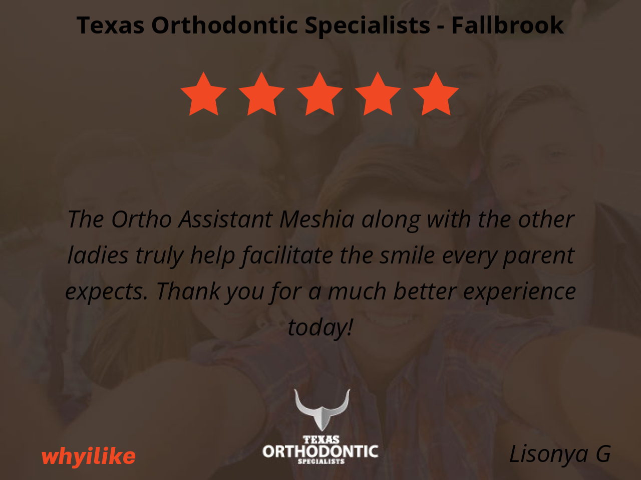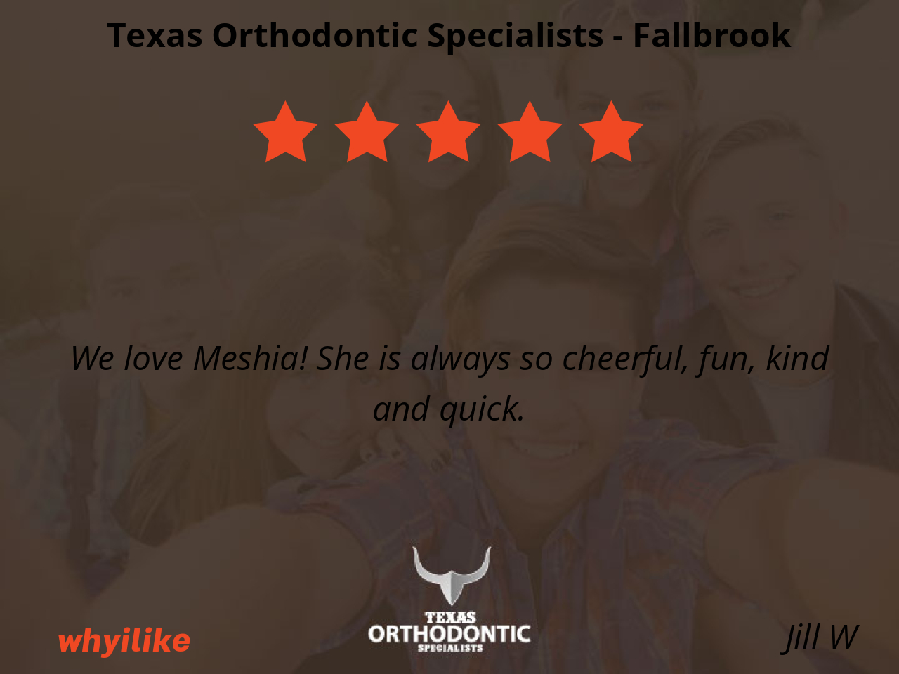 The Ortho Assistant Meshia along with the other ladies truly help facilitate the smile every parent expects. Thank you for a much better experience today!