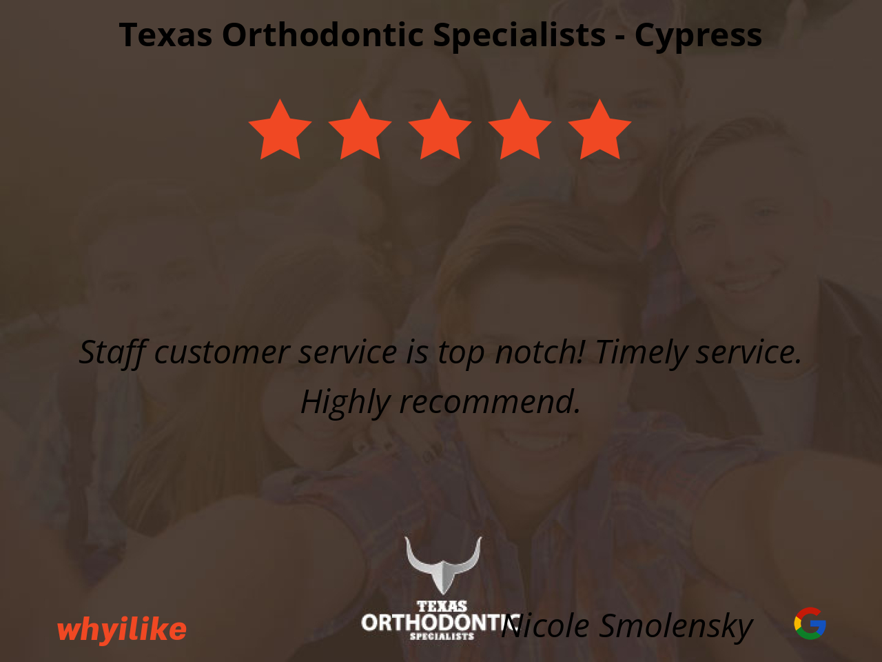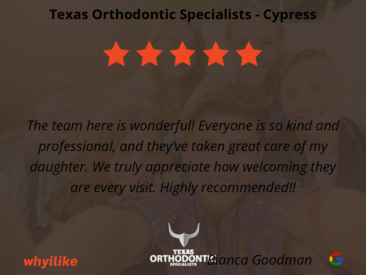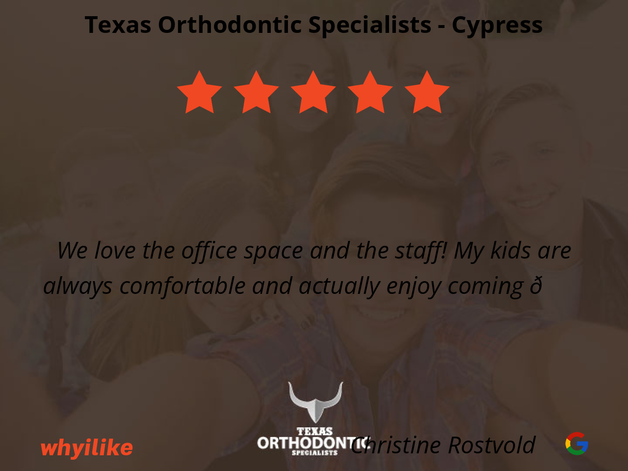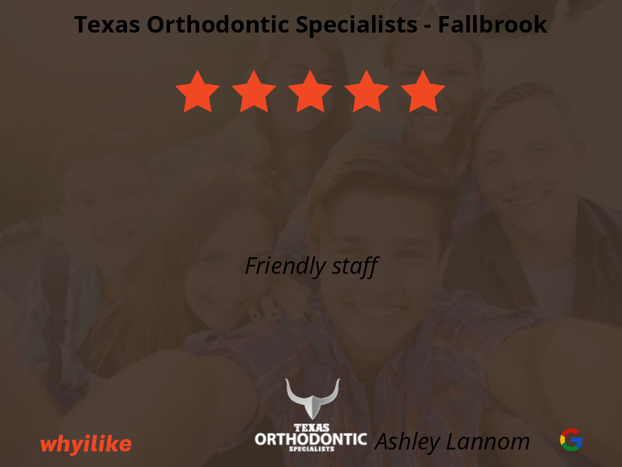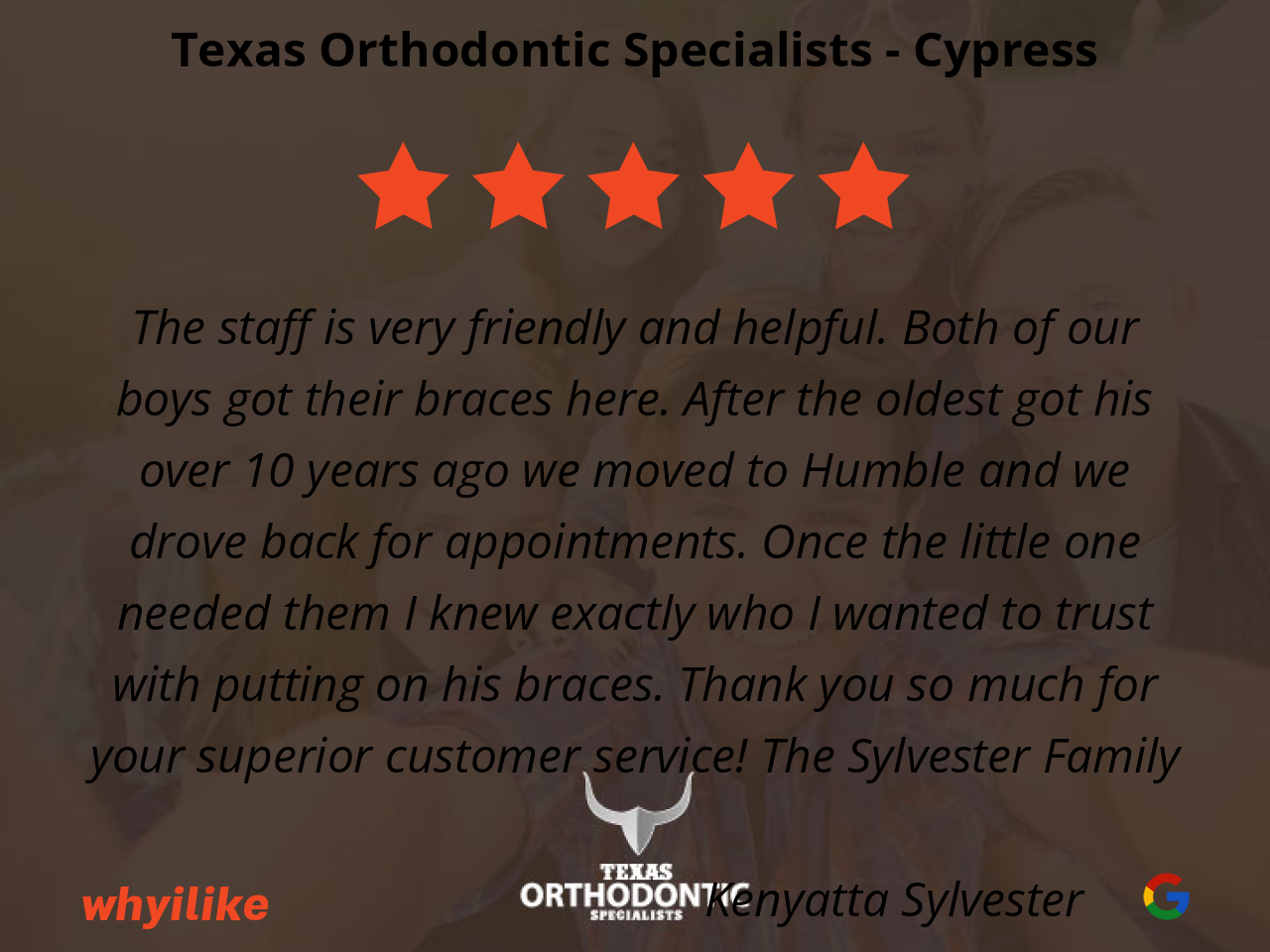 The staff is very friendly and helpful. Both of our boys got their braces here. After the oldest got his over 10 years ago we moved to Humble and we drove back for appointments. Once the little one needed them I knew exactly who I wanted to trust with putting on his braces. Thank you so much for your superior customer service! The Sylvester Family