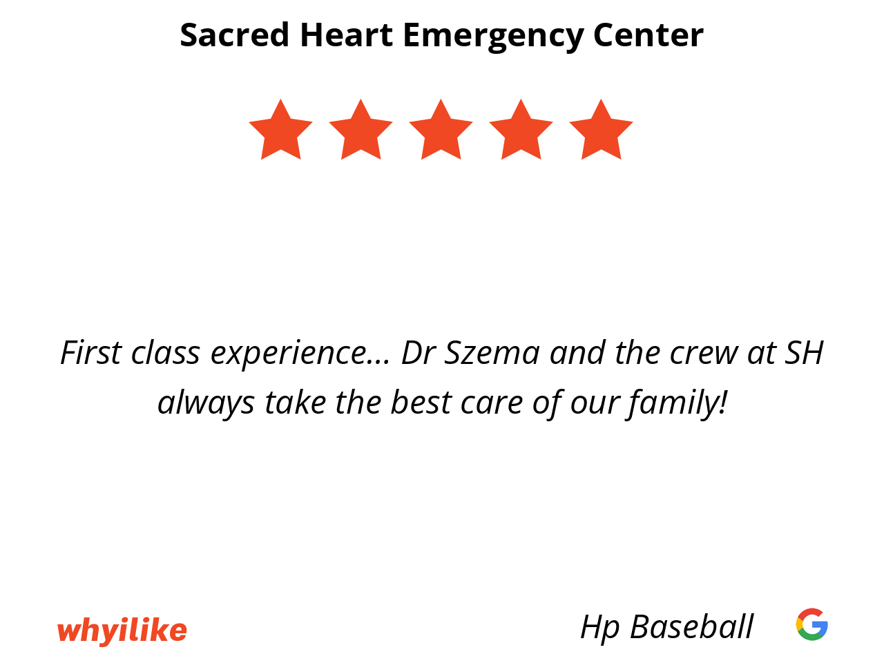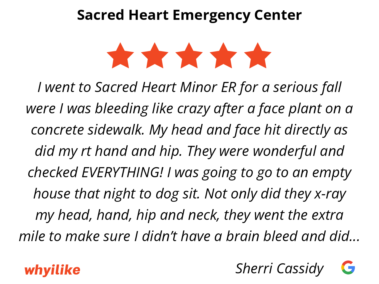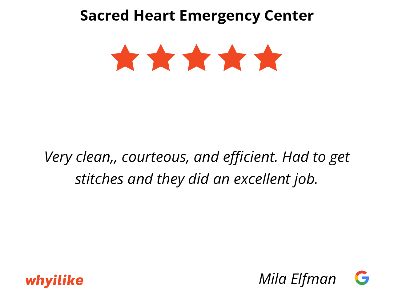 Had a little slip and bump that looked like it would need stitches. Our grandkids have been to Sacred Heart Emergency Room multiple times and the medical care has always been top notch. So we drove to Sacred Heart, quick, professional, CT scan, got several staples and headed home!