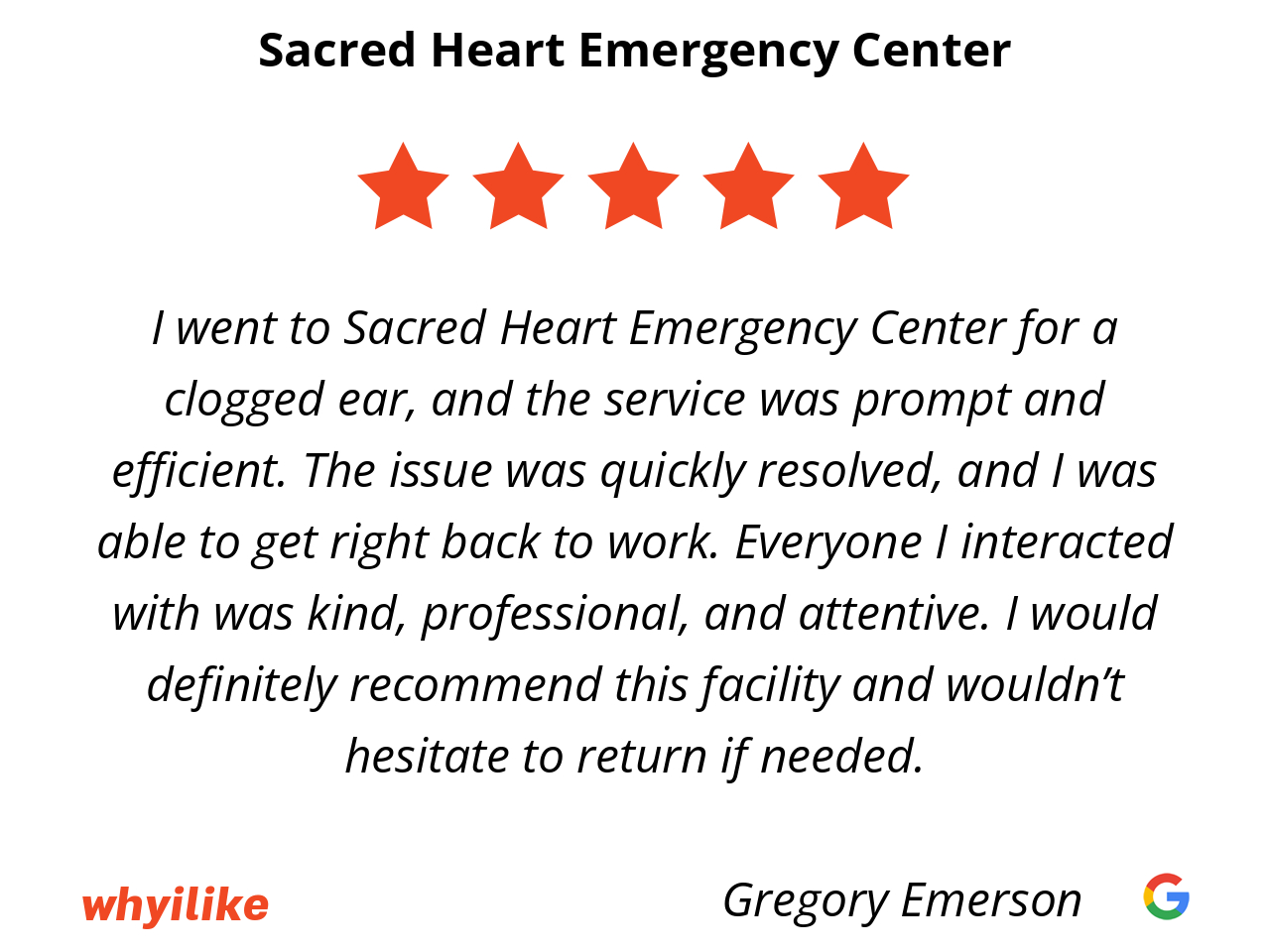 I went to Sacred Heart Emergency Center for a clogged ear, and the service was prompt and efficient. The issue was quickly resolved, and I was able to get right back to work. Everyone I interacted with was kind, professional, and attentive. I would definitely recommend this facility and wouldn’t hesitate to return if needed.