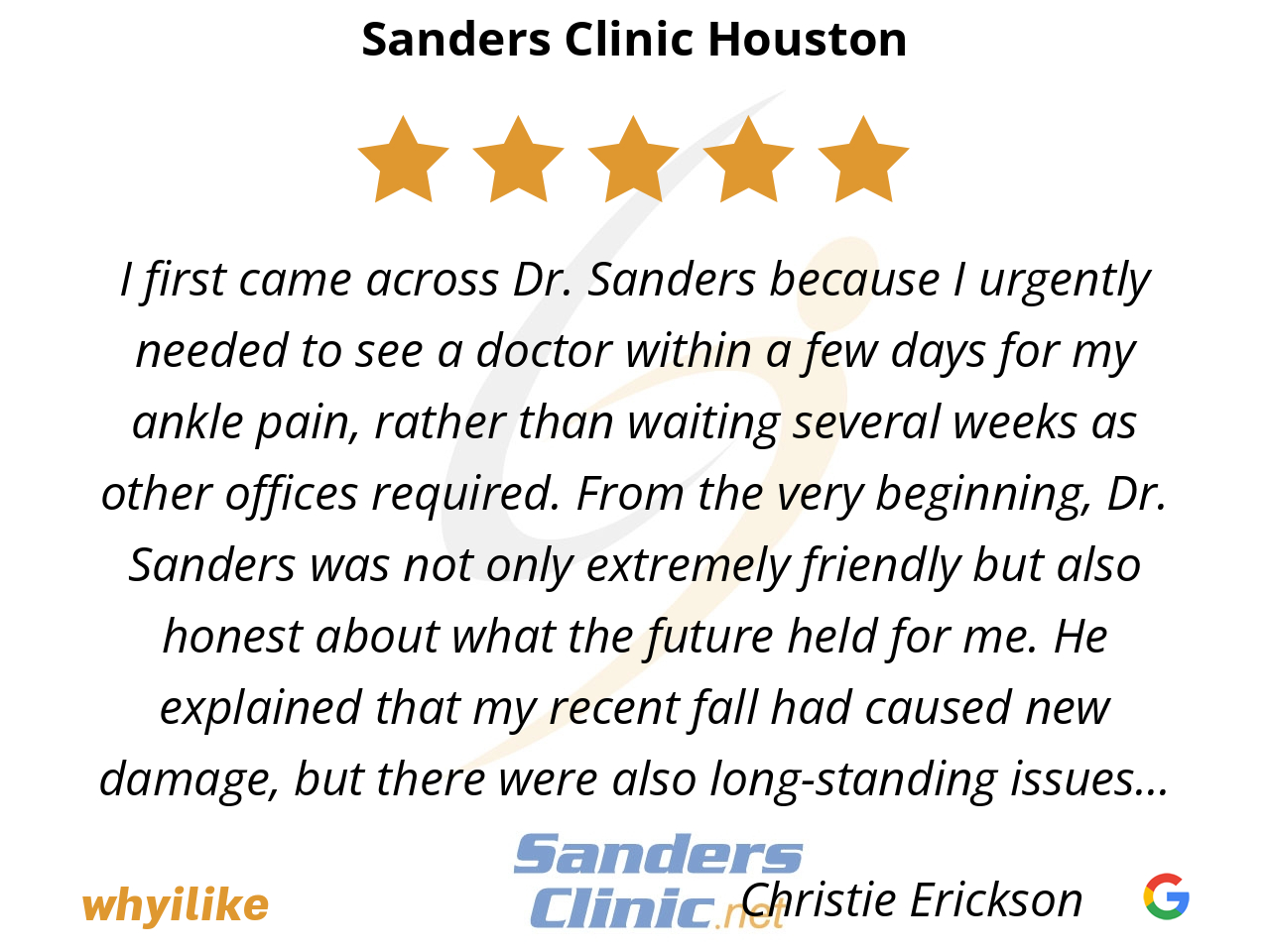 I first came across Dr. Sanders because I urgently needed to see a doctor within a few days for my ankle pain, rather than waiting several weeks as other offices required. From the very beginning, Dr. Sanders was not only extremely friendly but also honest about what the future held for me. He explained that my recent fall had caused new damage, but there were also long-standing issues from childhood that required correction.