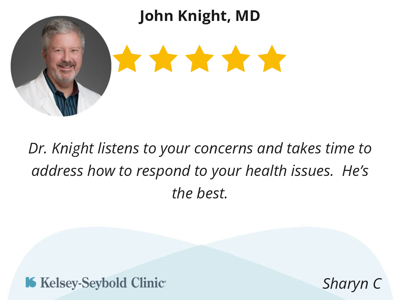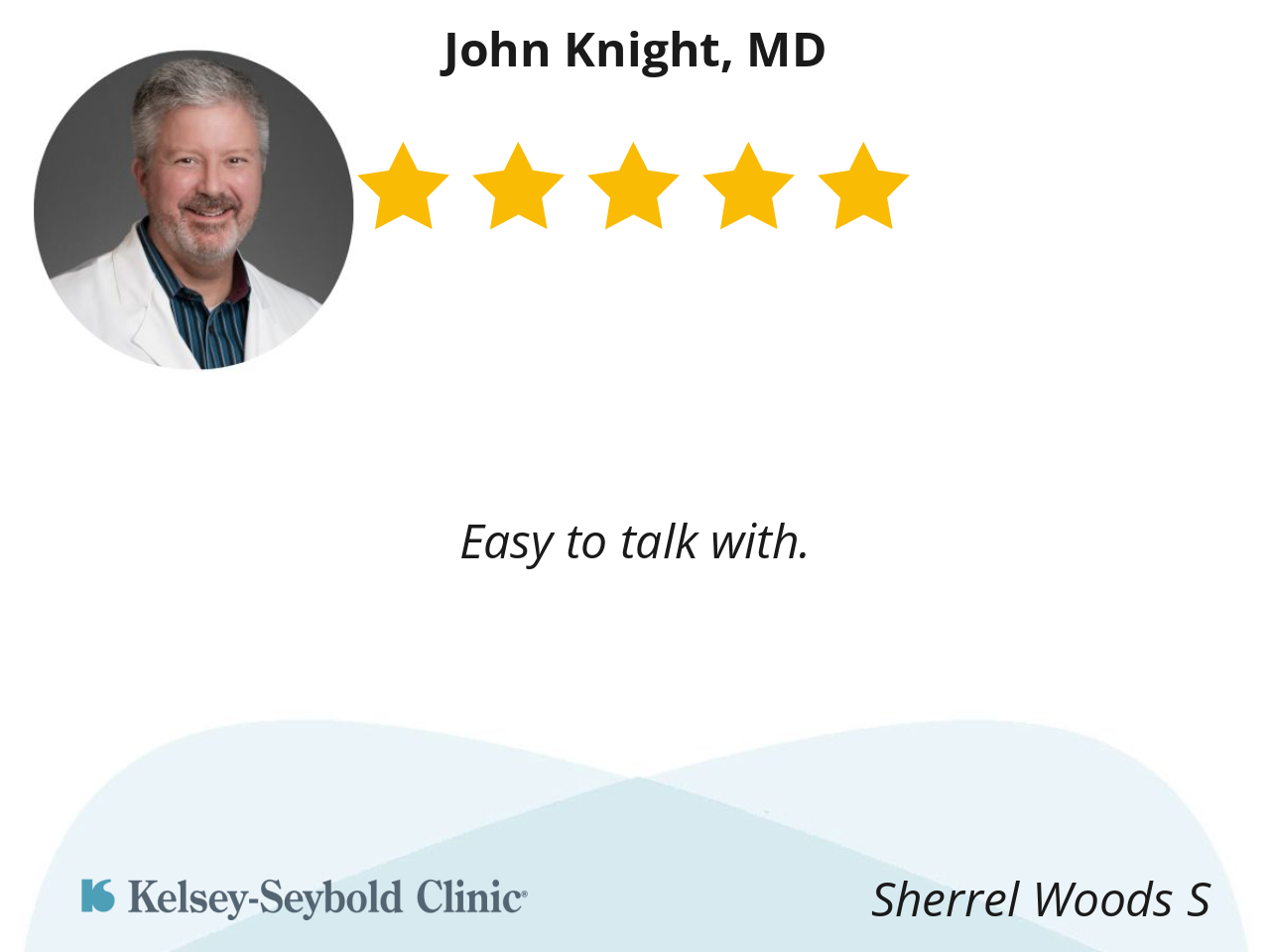 Dr knight is caring; he listens well; he explains everything well; he’s very knowledgeable and takes his time with you. He’s just a great doctor and human being.