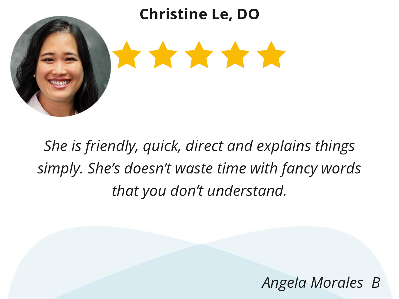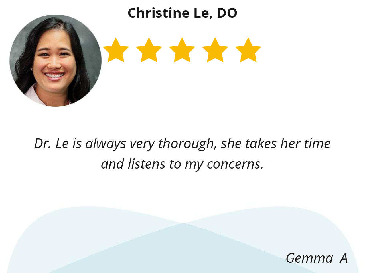 Christine Le DO has been my doctor for many years now. I have always enjoyed her upbeat spirit and forthright manner of speaking about different methods of care/prescriptions. I have engaged with several specialists over the years, but Dr. Le has been my main doctor through all of it.