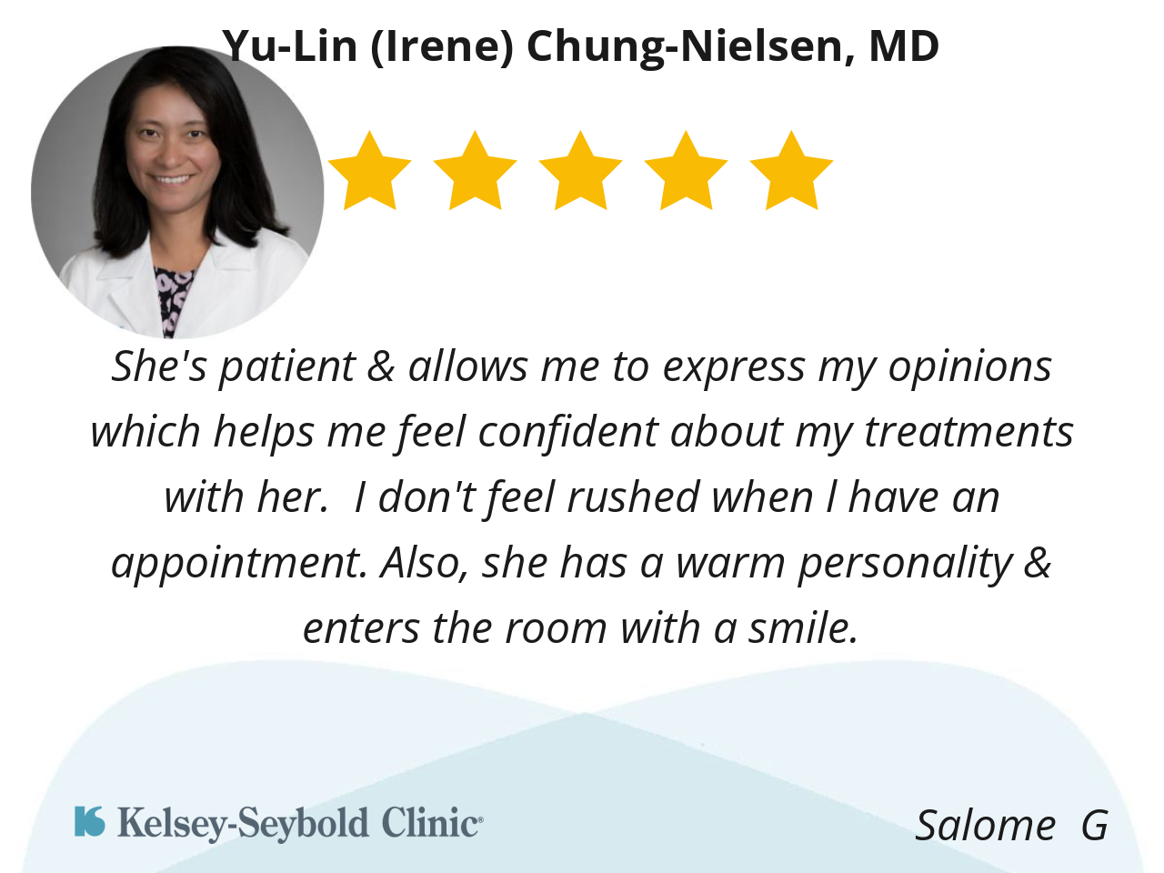 She's patient & allows me to express my opinions which helps me feel confident about my treatments with her. I don't feel rushed when l have an appointment. Also, she has a warm personality & enters the room with a smile.