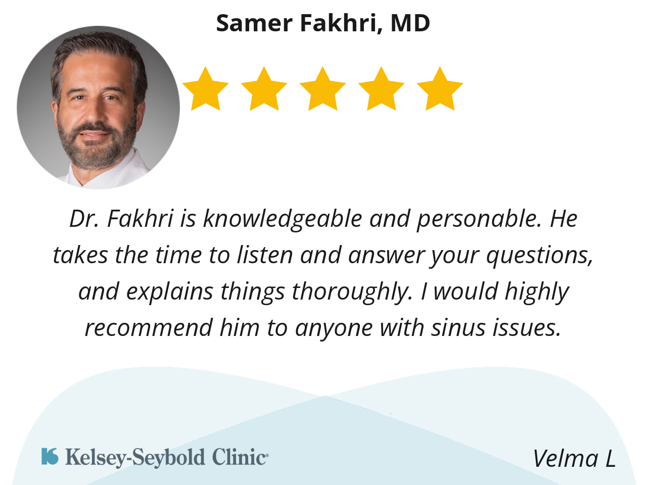 Dr. Fakhri is knowledgeable and personable. He takes the time to listen and answer your questions, and explains things thoroughly. I would highly recommend him to anyone with sinus issues.