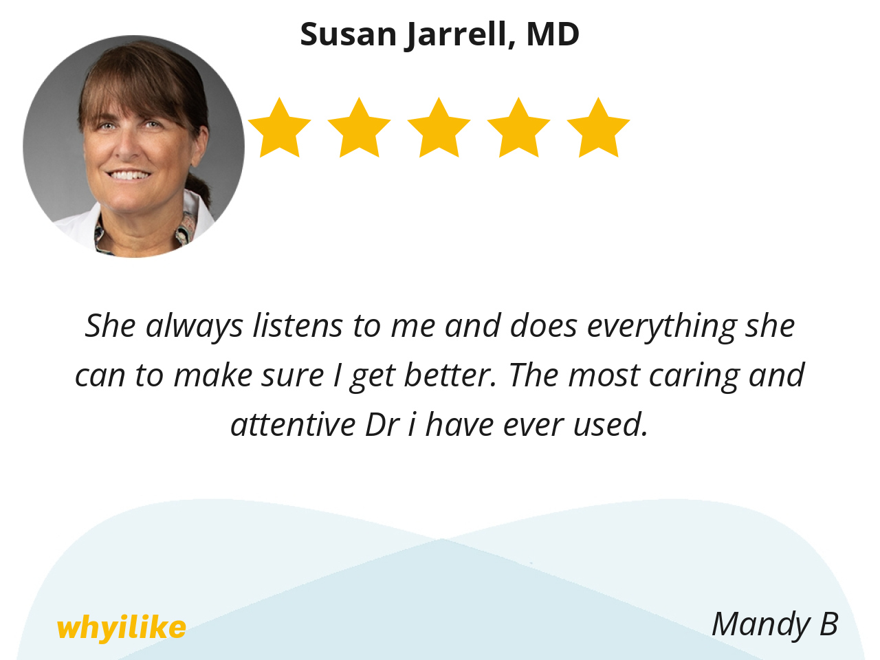 We absolutely love Dr. Jarrell at the Lake Jackson Clinic! She is very attentive, compassionate, listens to all our concerns, and answers our questions. We have been seeing her for over a year and have established her as our primary PCP. She is the best primary care doctor we have ever had. We look forward to a long term relationship with her.