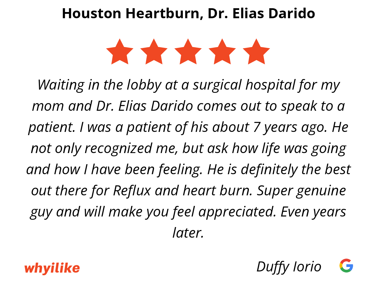 I cannot rate, Dr. Darido high enough. He truly is the best heart burn/acid reflux surgeon in the city of Houston and probably the state of Texas. I have spent the last 5 to 7 years with severe acid reflux, while seeing a gastrologist every three months for follow up appointments.