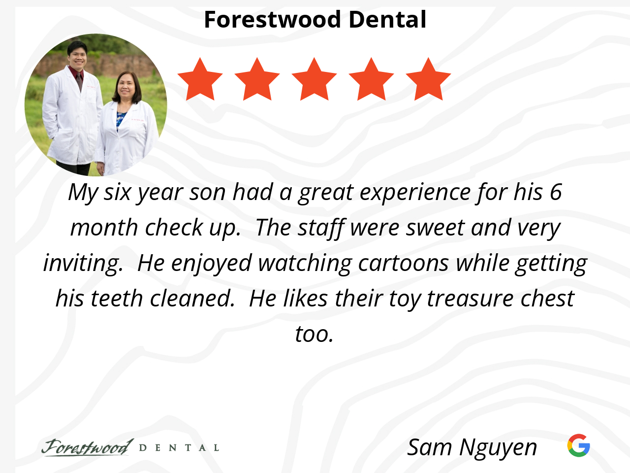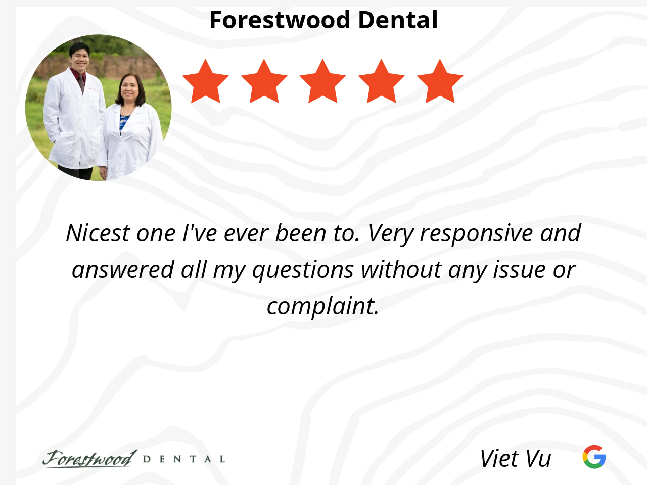 Going to Forrestwood is always a great experience. I’ve been a patient of Dr Nguyen for over 15 years and they are always nice, professional and take good care of their patients. Highly recommend Forrestwood to anyone looking for great dentistry.