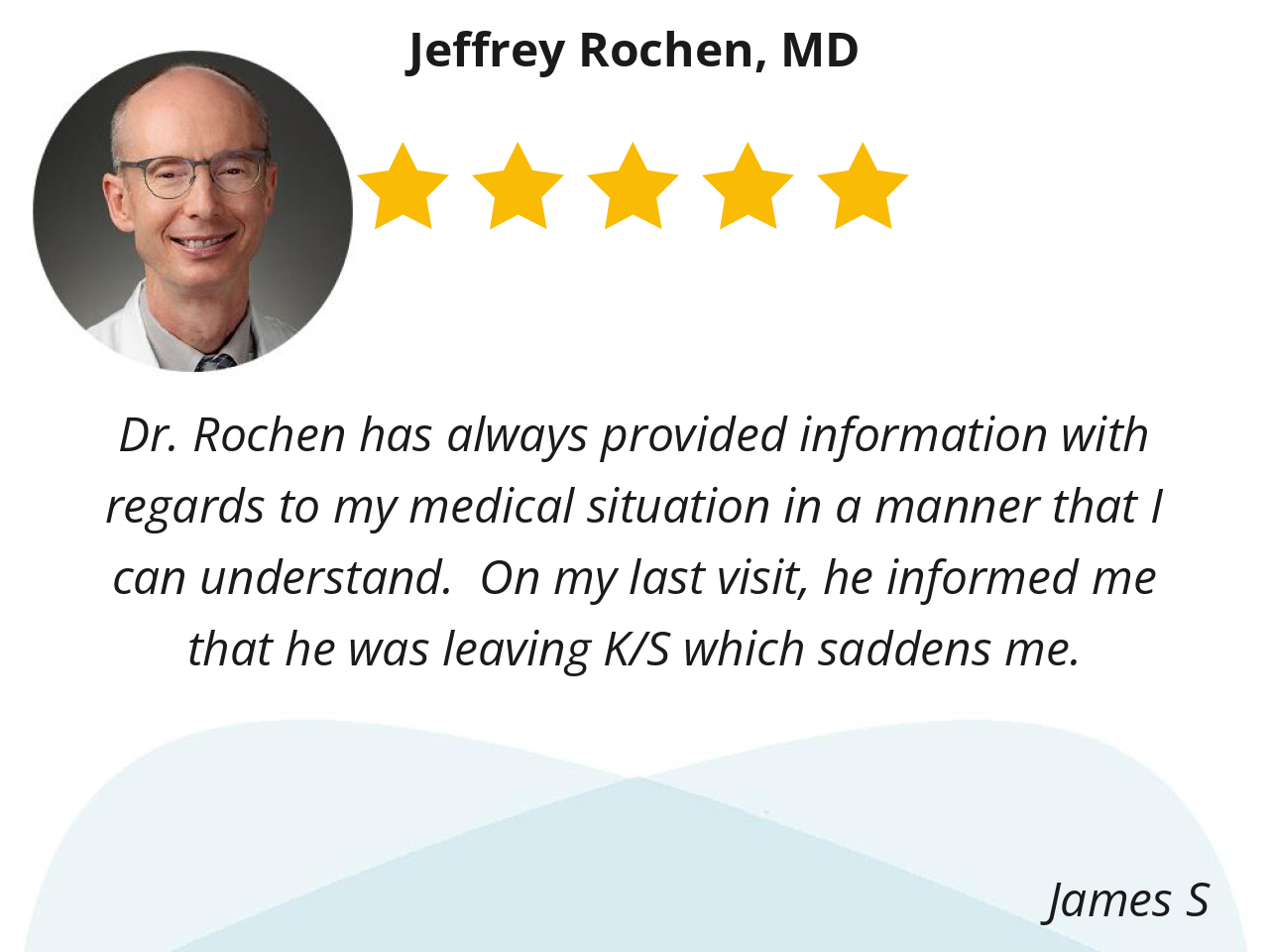 Dr. Rochen has always provided information with regards to my medical situation in a manner that I can understand. On my last visit, he informed me that he was leaving K/S which saddens me.