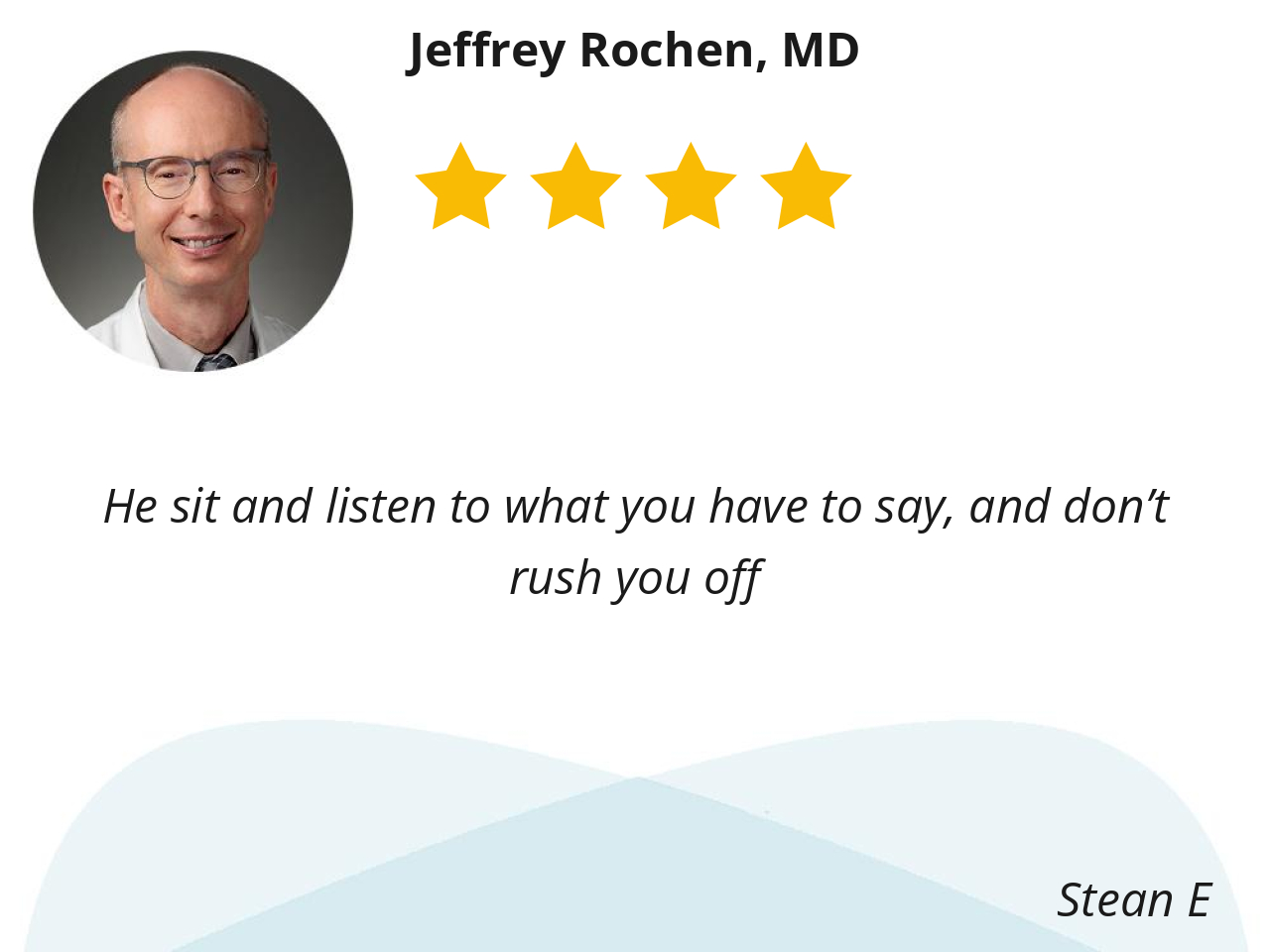 Dr. Rochen is one of my favorite doctors! Alway prompt and prepared for my visit. Great communication. Explains test results and discusses treatment options. I feel like I am part of the decision making process.