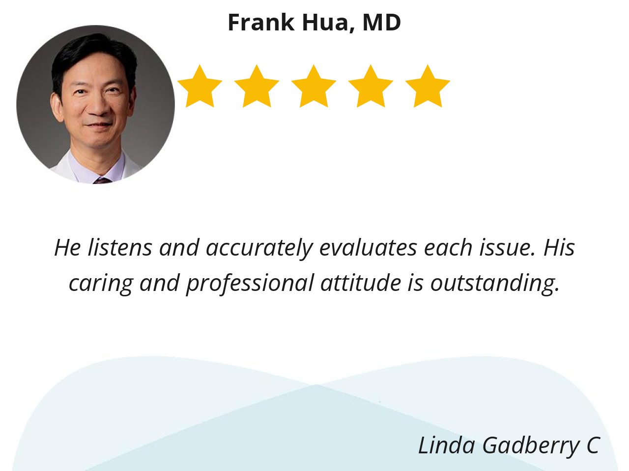 Dr. Hua is incredibly awesome!! He listens and cares!! Great bedside manner as well!!
