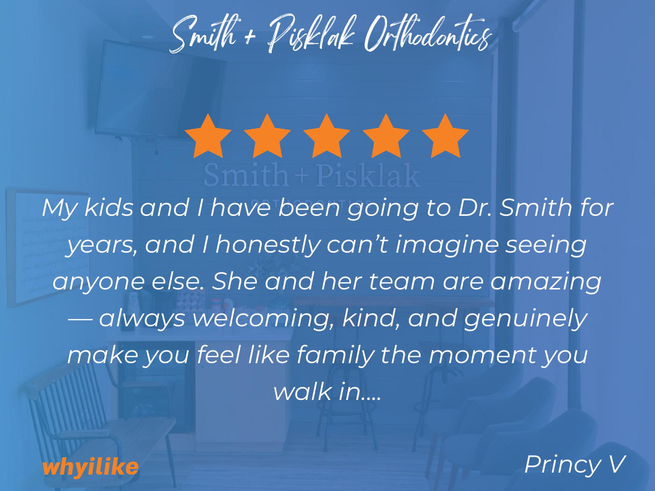 My kids and I have been going to Dr. Smith for years (braces for the kiddos and Invisalign for me), and I honestly can’t imagine seeing anyone else. She and her team are amazing — always welcoming, kind, and genuinely make you feel like family the moment you walk in.