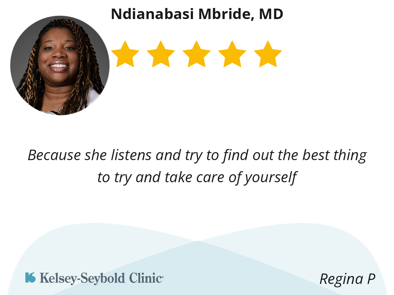 Dr. Mbride is an exceptional physician who consistently demonstrates a high level of care and professionalism. She is attentive, approachable, and always willing to answer my questions thoroughly. Her friendly and personable demeanor creates a welcoming environment, and she takes the time to ensure that I feel heard and supported during every visit. I am completely at ease in her care and highly value the trust and comfort she fosters.