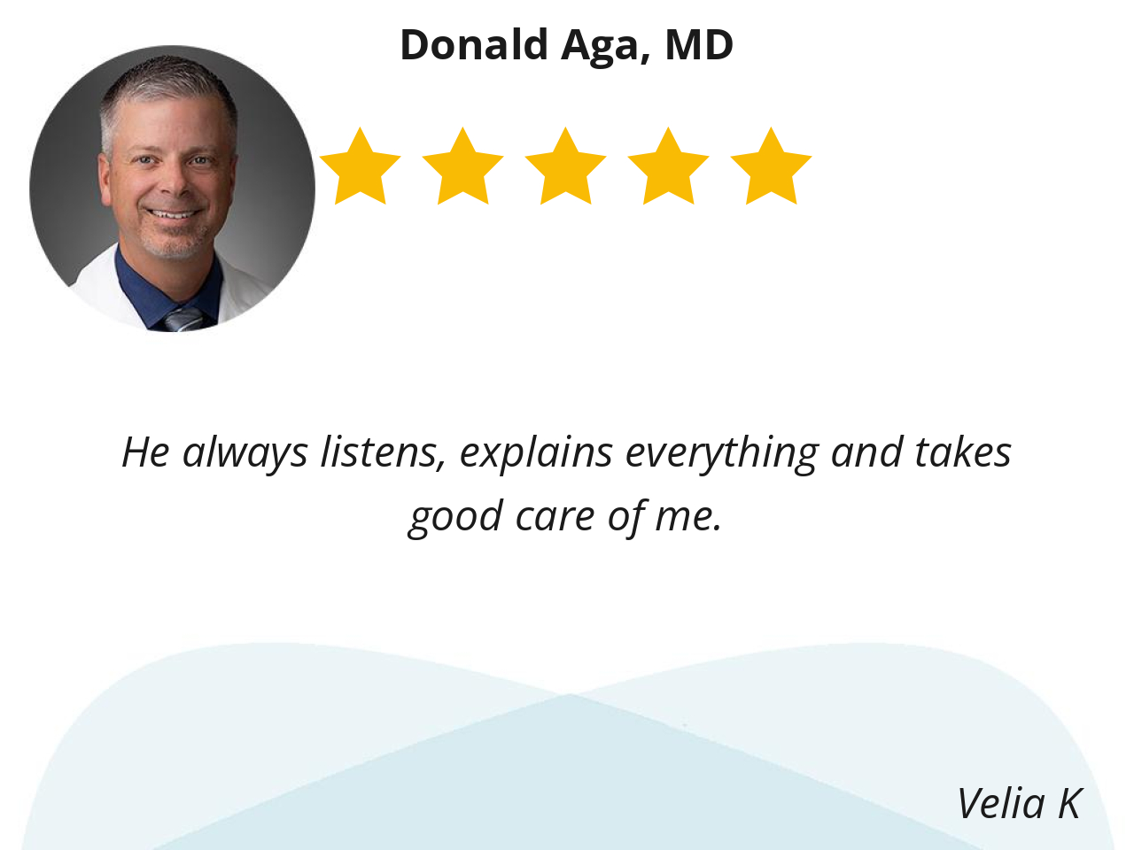 Dr. Aga is what everyone wants in a PCP. It is personable, knowledgeable, and extremely intelligent. He looks after his patients and treats them as people who need to have their medical conditions known and if needed treated. And he spends time with his patients and give them the information that they need about their health. In short, Donnie Aga is a great doc and I and my wife are really fortunate that he is our doc.