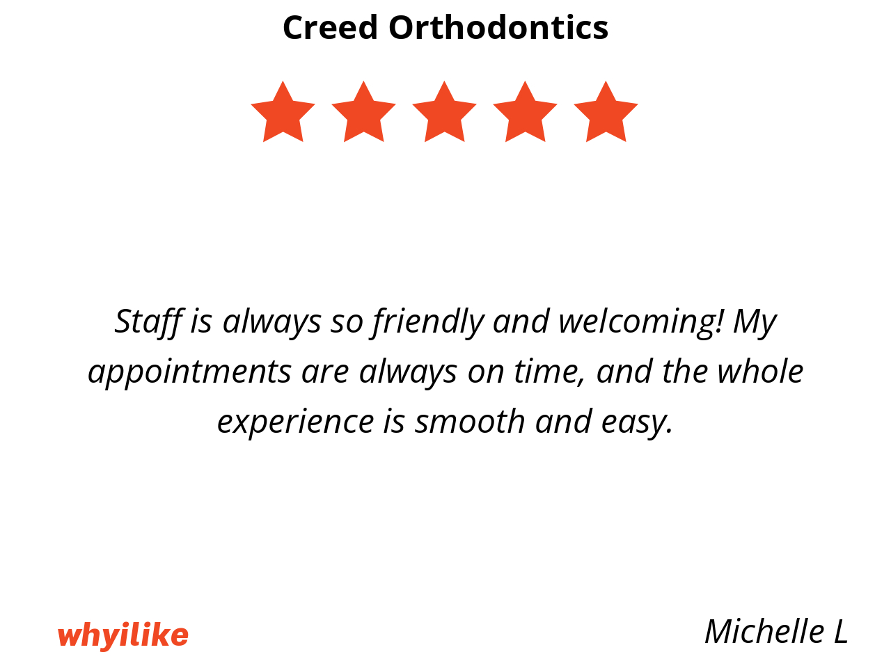 Aside from Dr. Creed being the BEST; this office is run so smoothly and efficiently. Whether on the phone or in the office the staff is welcoming, sweet and very accommodating. I highly recommend Creed Orthodontics.