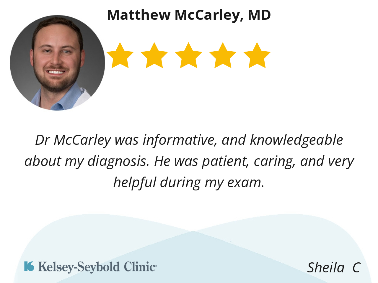 Dr. McCarley is an excellent Orthopedic surgeon! He is an attentive listener and is proactive in his approach to treatment options and does not automatically recommend surgery, when more testing or another method could be more appropriate. I appreciate that he reviews all xrays and MRI's directly with you and thoroughly explains the results, before discussing a treatment plan. As a complex patient medically, having a physician willing to collaborate with me regarding my care is a huge relief. I'm so happy I found him thru Kelsey Seybold.