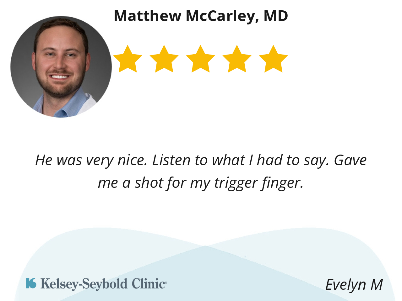 Dr. McCarley is an excellent Orthopedic surgeon! He is an attentive listener and is proactive in his approach to treatment options and does not automatically recommend surgery, when more testing or another method could be more appropriate. I appreciate that he reviews all xrays and MRI's directly with you and thoroughly explains the results, before discussing a treatment plan. As a complex patient medically, having a physician willing to collaborate with me regarding my care is a huge relief. I'm so happy I found him thru Kelsey Seybold.