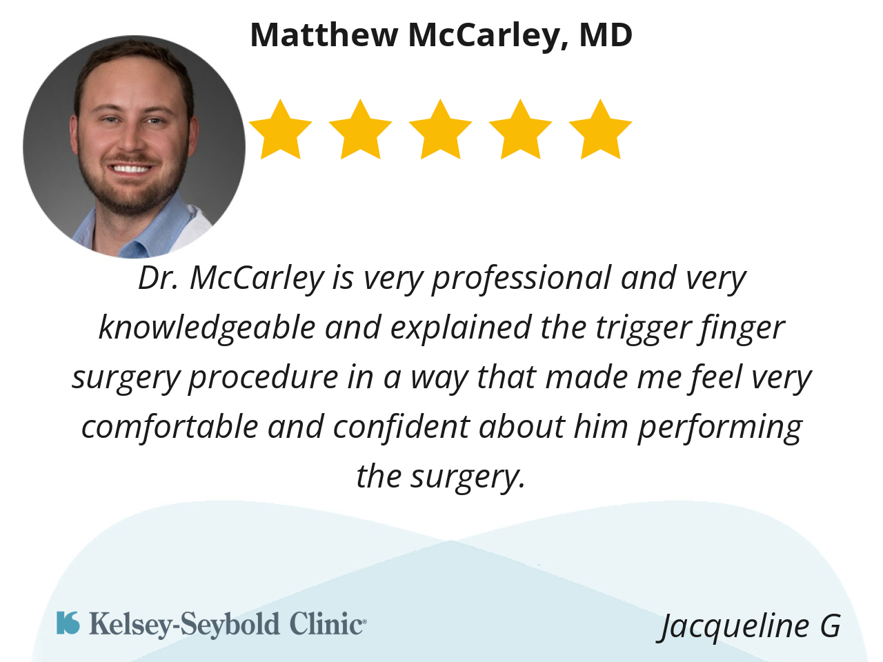 Dr. McCarley is very professional and very knowledgeable and explained the trigger finger surgery procedure in a way that made me feel very comfortable and confident about him performing the surgery.