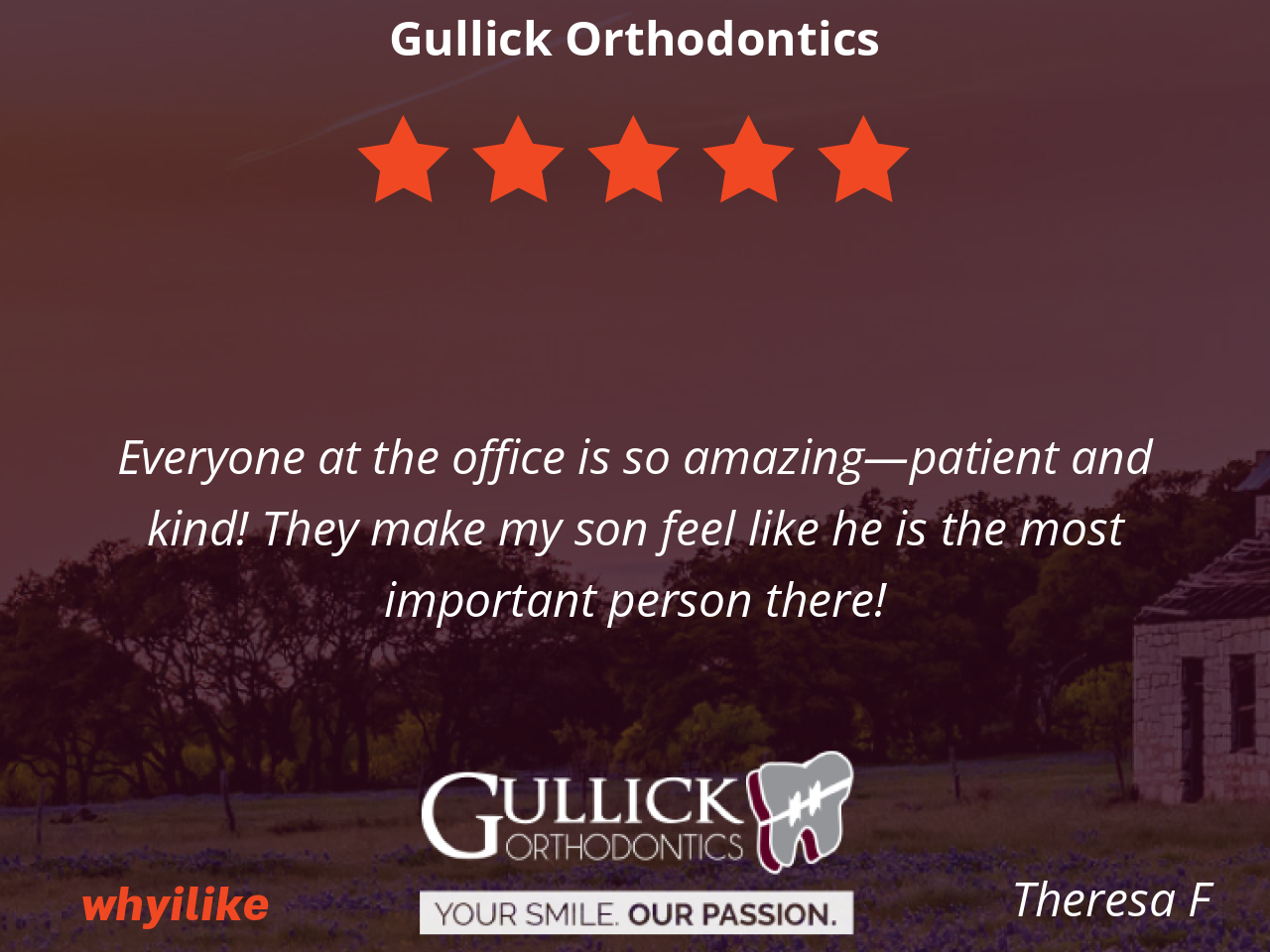 I like Gullick Orthodontics because they make you feel like you’re family! As soon as you walk in the door, you receive a warm welcome! Excited that I was referred to this wonderful practice!