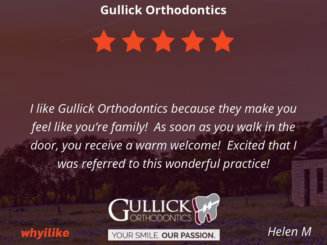 I like Gullick Orthodontics because they make you feel like you’re family! As soon as you walk in the door, you receive a warm welcome! Excited that I was referred to this wonderful practice!